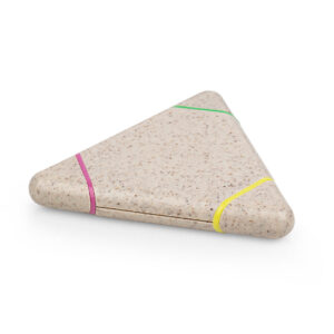 Resaltador con forma triangular, con 3 colores de tinta: azul, rosado y amarillo. Elaborado con paja de trigo. MATERIAL: Paja de trigo MEDIDAS: 9 cm x 9 cm x 1,2 cm. ÁREA DE IMPRESIÓN APROXIMADA: Tampo: 4 cm x 2 cm MARCA: Tampografía con tratamiento hasta 5 tintas. Impresión Digital EMPAQUE: 500 Unidades en caja…