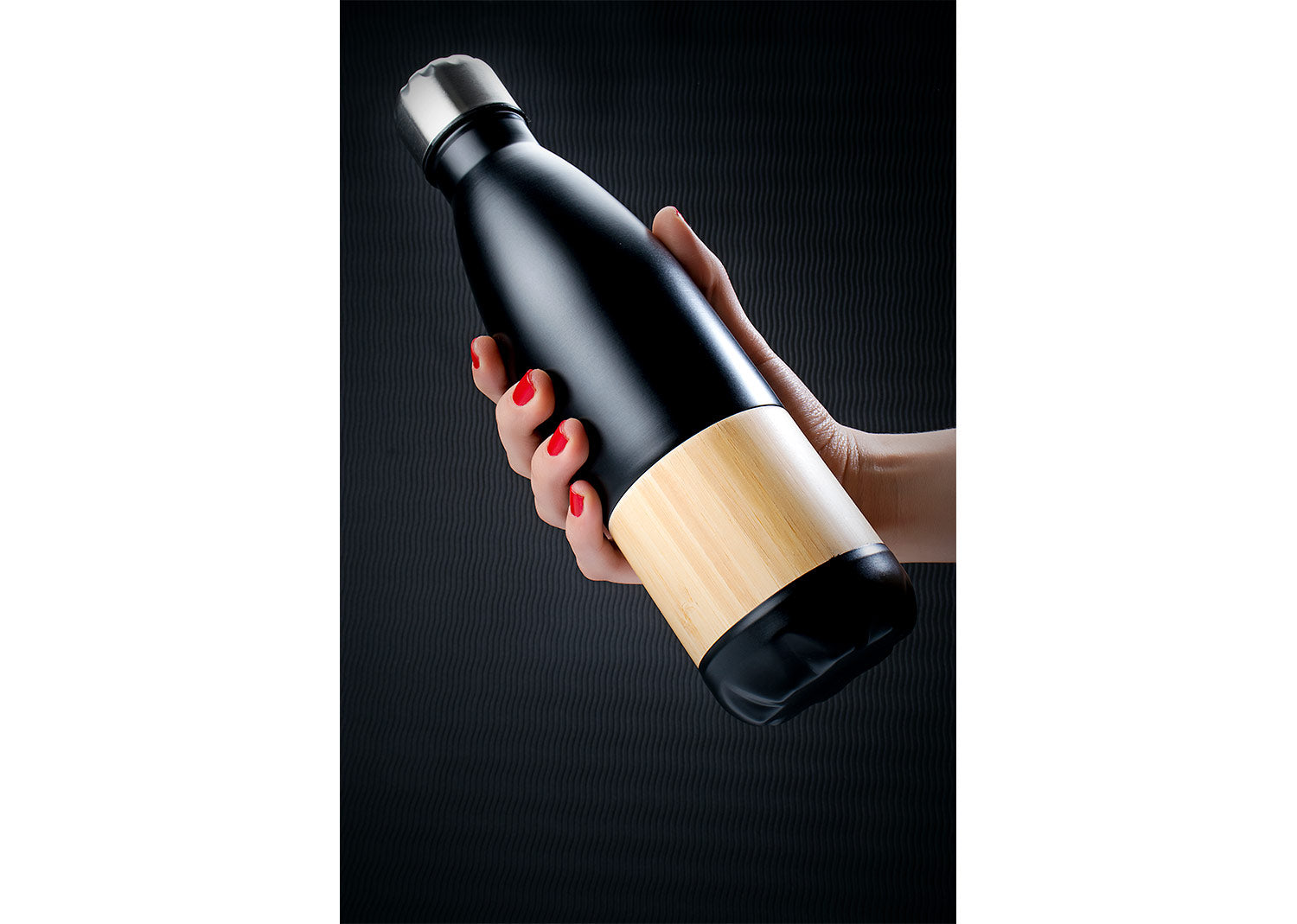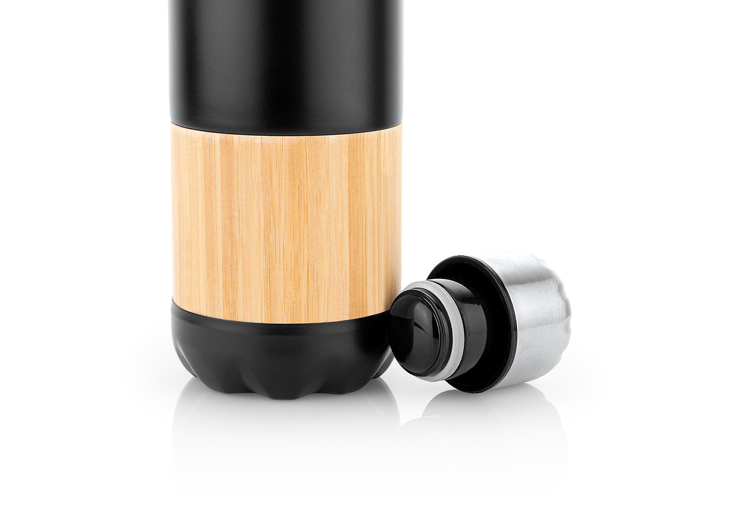 Botella en acero con aplique en la parte exterior en bambú y tapa rosca. Capacidad de 500 ml / 17 Oz. Mantiene la temperatura caliente hasta por 12 horas y fría hasta 24 horas.