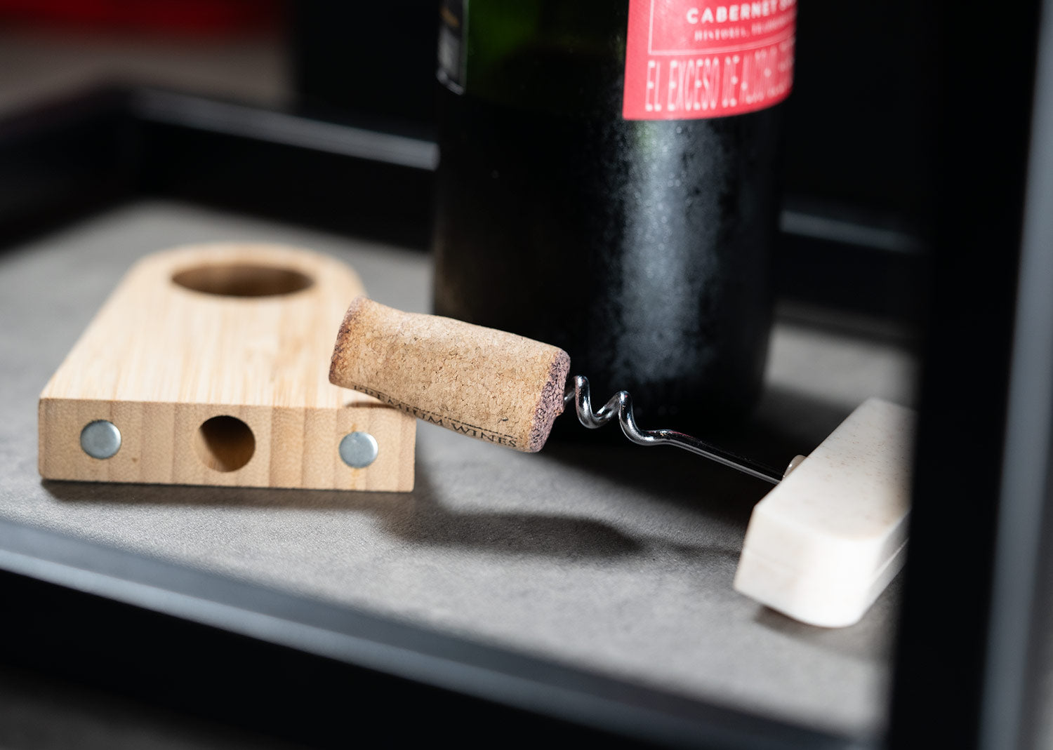 Elegante soporte de bambú que incluye un abridor de botellas elaborado en fibra de paja de trigo. Ambos elementos se mantienen unidos gracias a un imán integrado.