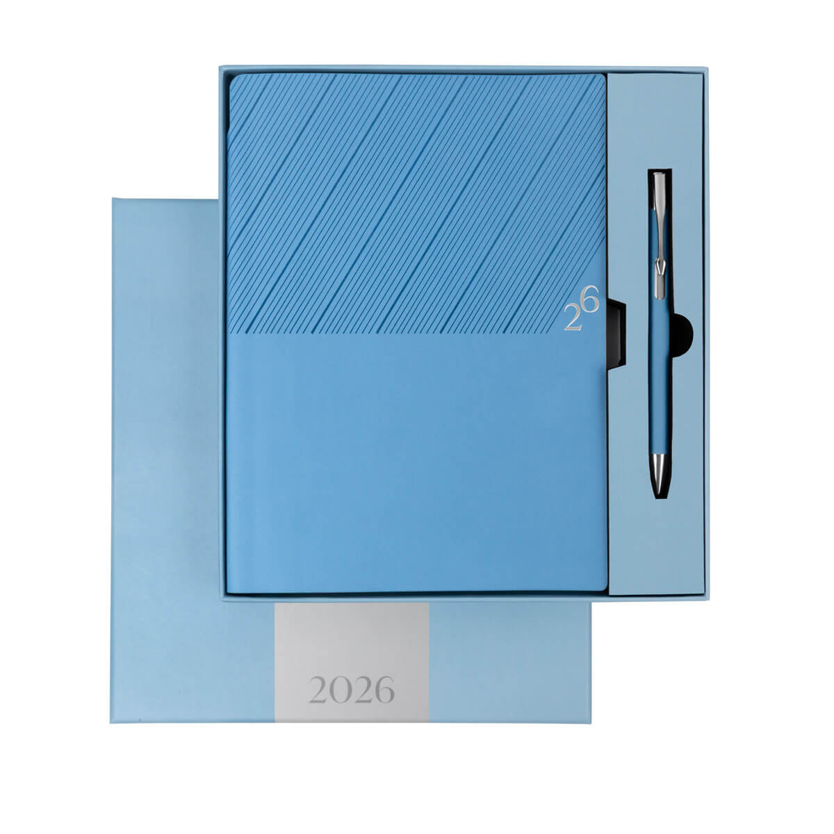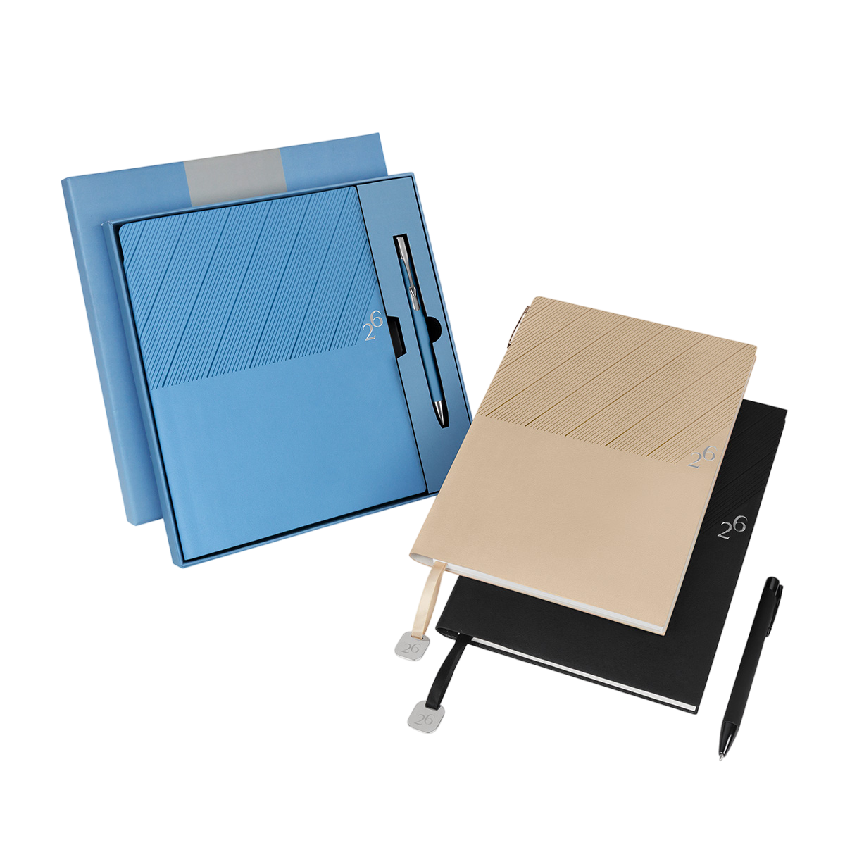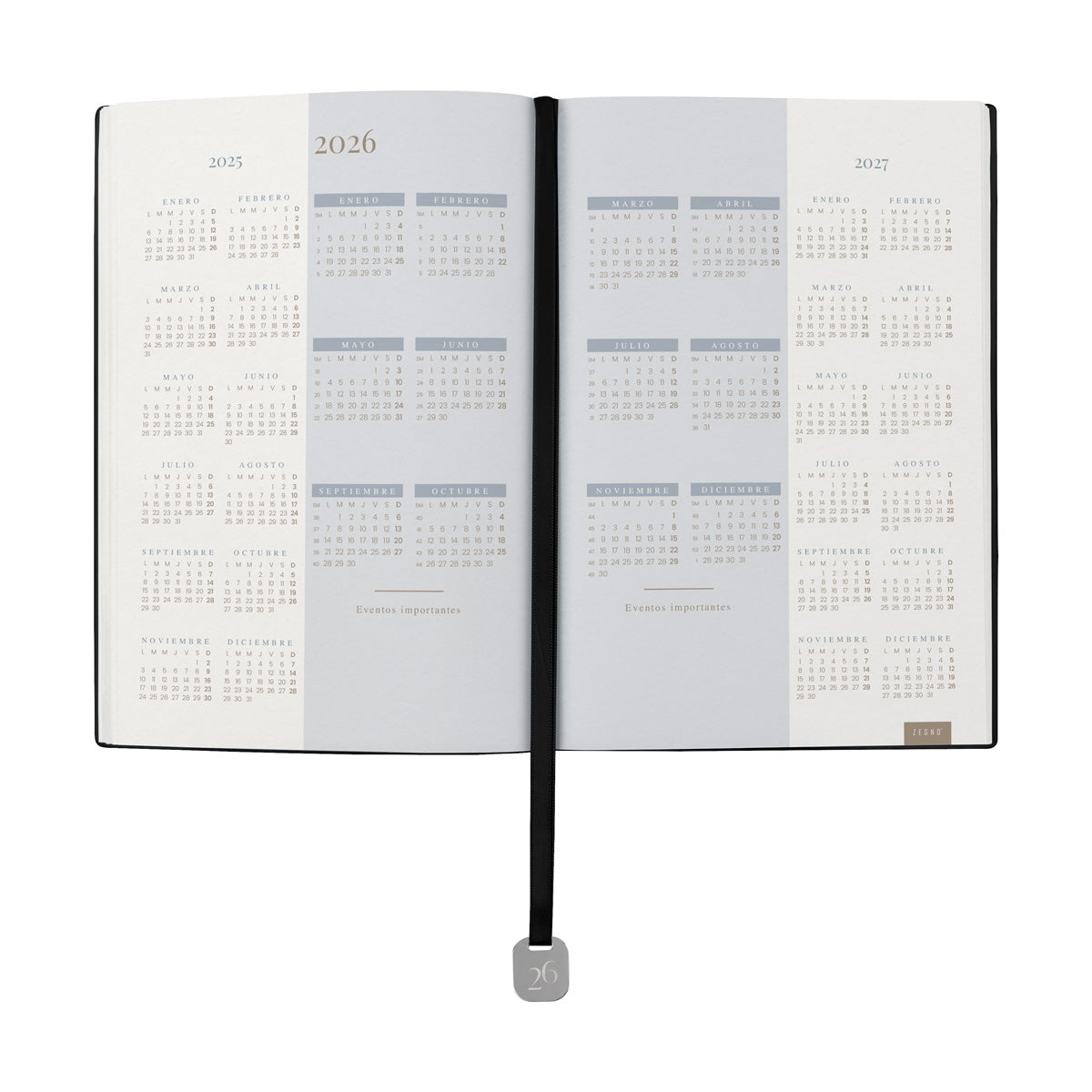 Descripción: Agenda semanal con 100 hojas. Contiene datos personales, calendarios 2025-2026-2027, planeador 2026, presupuesto de gastos, seguimiento de nuevos habitos, organizador de tareas y planeador de proyecto. Incluye caja individual del mismo color a la agenda, separador con placa metalica y boligrafo.
