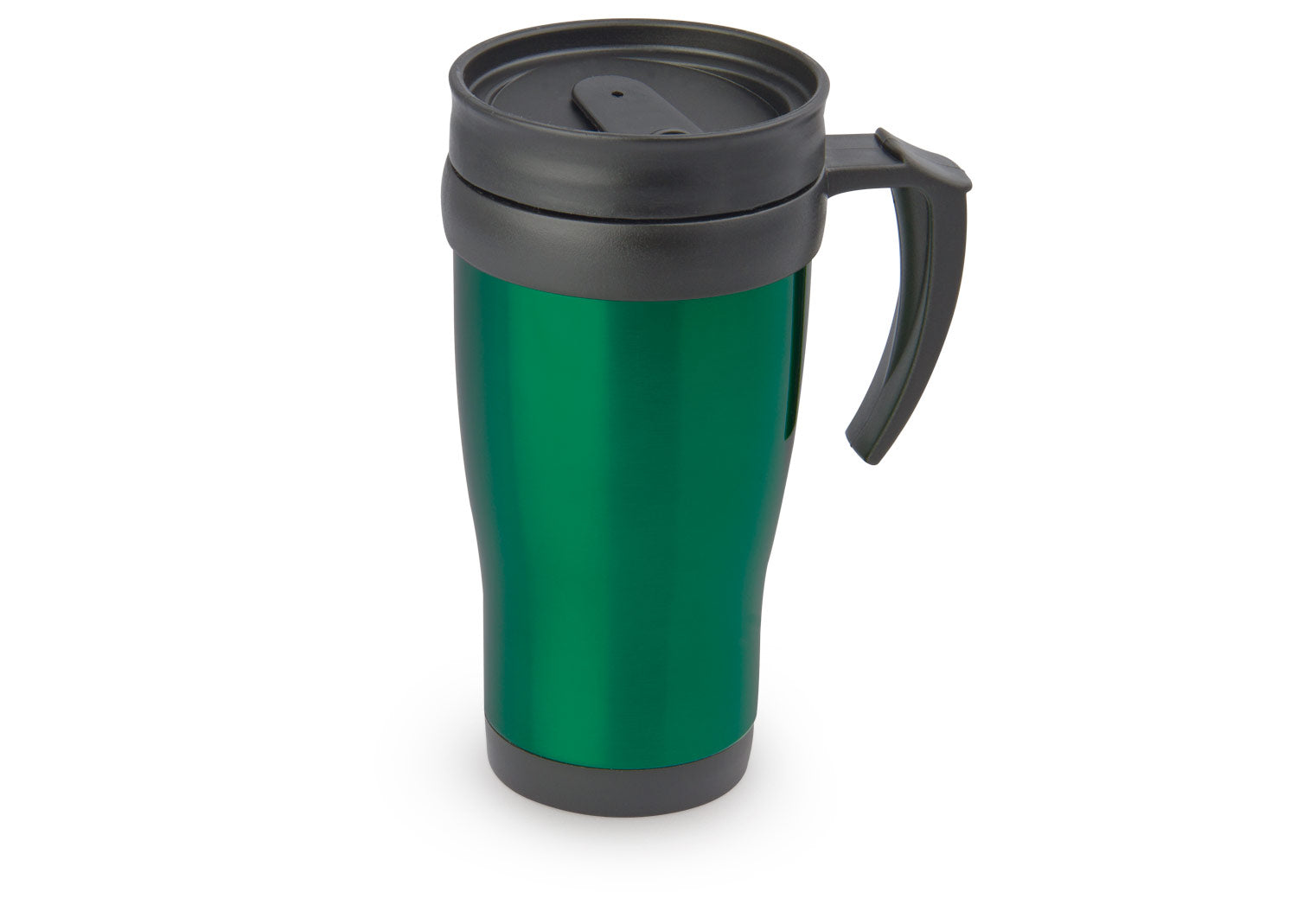 Mug viajero doble pared con recubrimiento interior plástico, que permite la conservación de la temperatura de acuerdo al ambiente. Con agarradera y tapa corrediza para fácil transporte. Capacidad: 450 ml / 15 Oz.