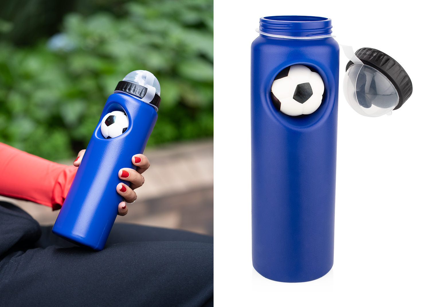 Botella deportiva de PE, ideal para actividades físicas. Su diseño incluye un antiestrés con forma de balón de fútbol (Ø 4,7), que se puede insertar y retirar del cuerpo de la botella, ofreciendo una función lúdica y relajante. Cuenta con tapa con boquilla de cierre giratorio para un consumo práctico, y un protector con asa que cubre la boquilla, manteniéndola limpia y facilitando su transporte. Capacidad: 800 ml / 27 Oz.