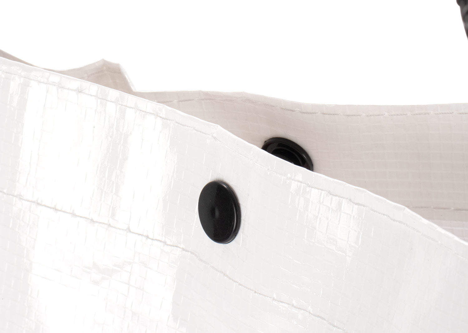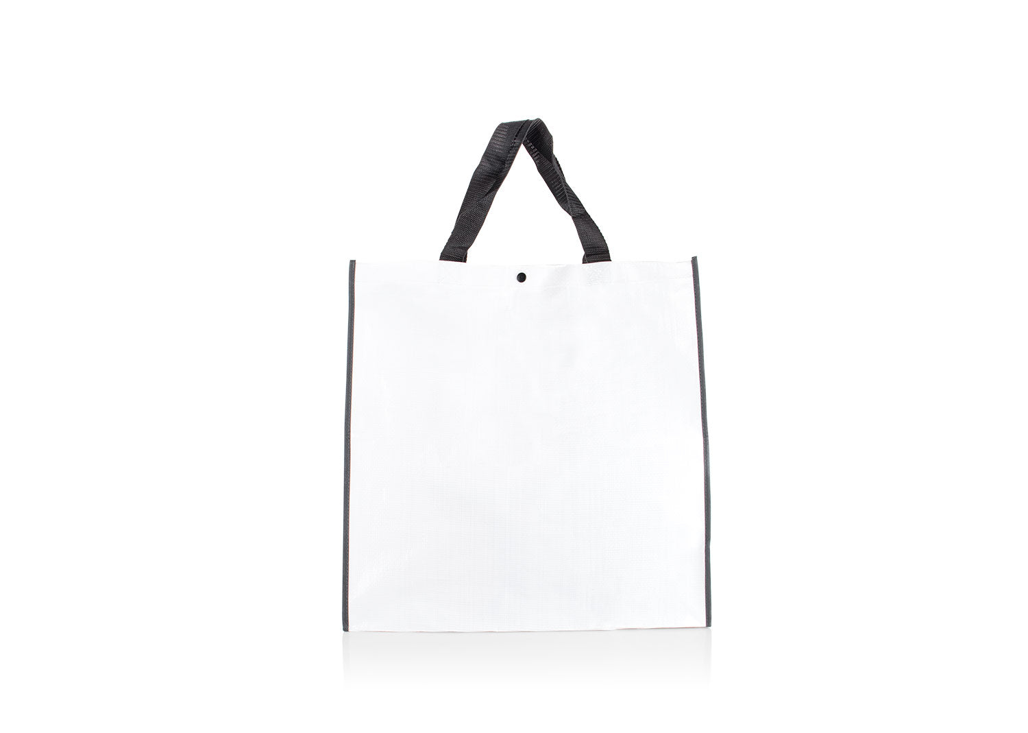 Bolsa plástica reutilizable cosida de gran capacidad, con manija de tela y botón en la parte superior para cierre. Útil para librerías, mercados, tiendas de comestibles, etc.