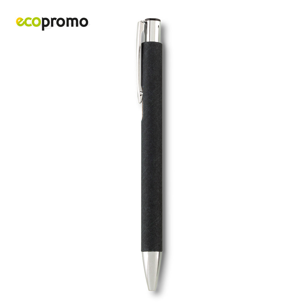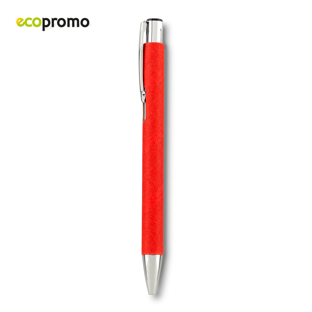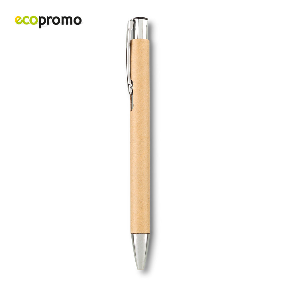 Bolígrafo con partes plásticas y cuerpo de cartón. Clip metálico. Mecanismo push.