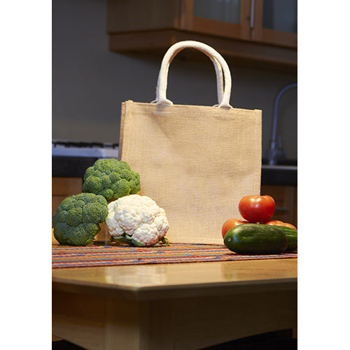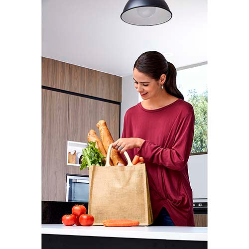 Descripción: Bolsa con fuelle y asas redondeadas. Interior plastificado. El yute es un producto natural el cual puede presentar variaciones en tonalidades y en la urdimbre y trama de la tela.