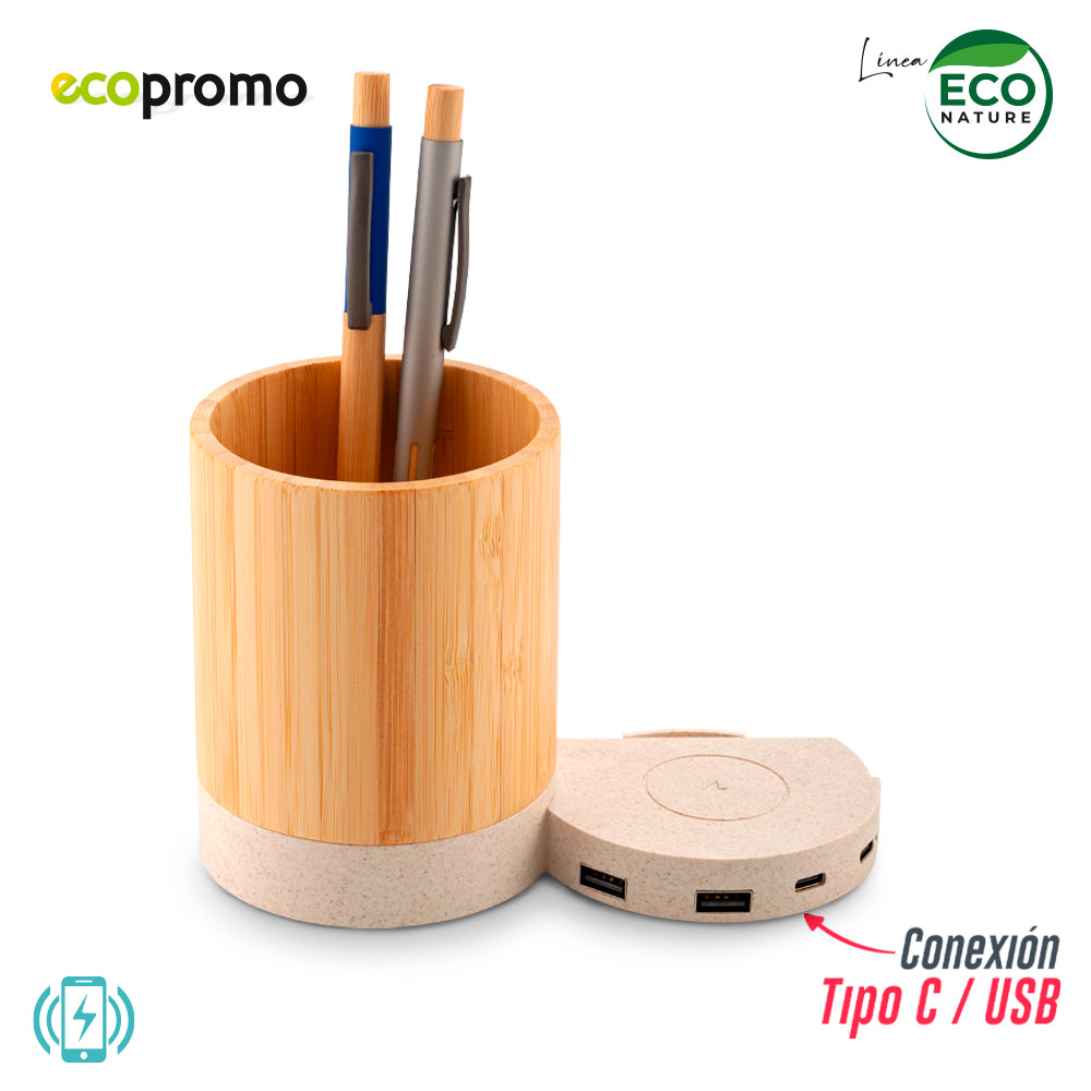 Cargador inalámbrico en fibra de trigo de 5W con portabolígrafos en bambú. Dos puertos USB y dos Tipo C. Incluye cable Tipo C para carga. Empaque caja individual.Lo que de saber: Este artículo transmite la energía y NO acumula carga para llevar, funciona siempre y cuando esté conectado. Sirve únicamente en dispositivos móviles que vengan desde fábrica con la funcionalidad de carga inalámbrica.Nota ImportanteLa tecnología de carga inalámbrica funciona con los dispositivos móviles compatibles con esta funcionalidad; se recomienda buscar en las especificaciones de su dispositivo móvil y en el manual de uso que puede descargarse para cada marca y modelo, si su dispositivo es compatible. Se recomienda retirar el forro protector de su móvil y cualquier otro elemento que genere interferencia cuando se coloque a cargar.