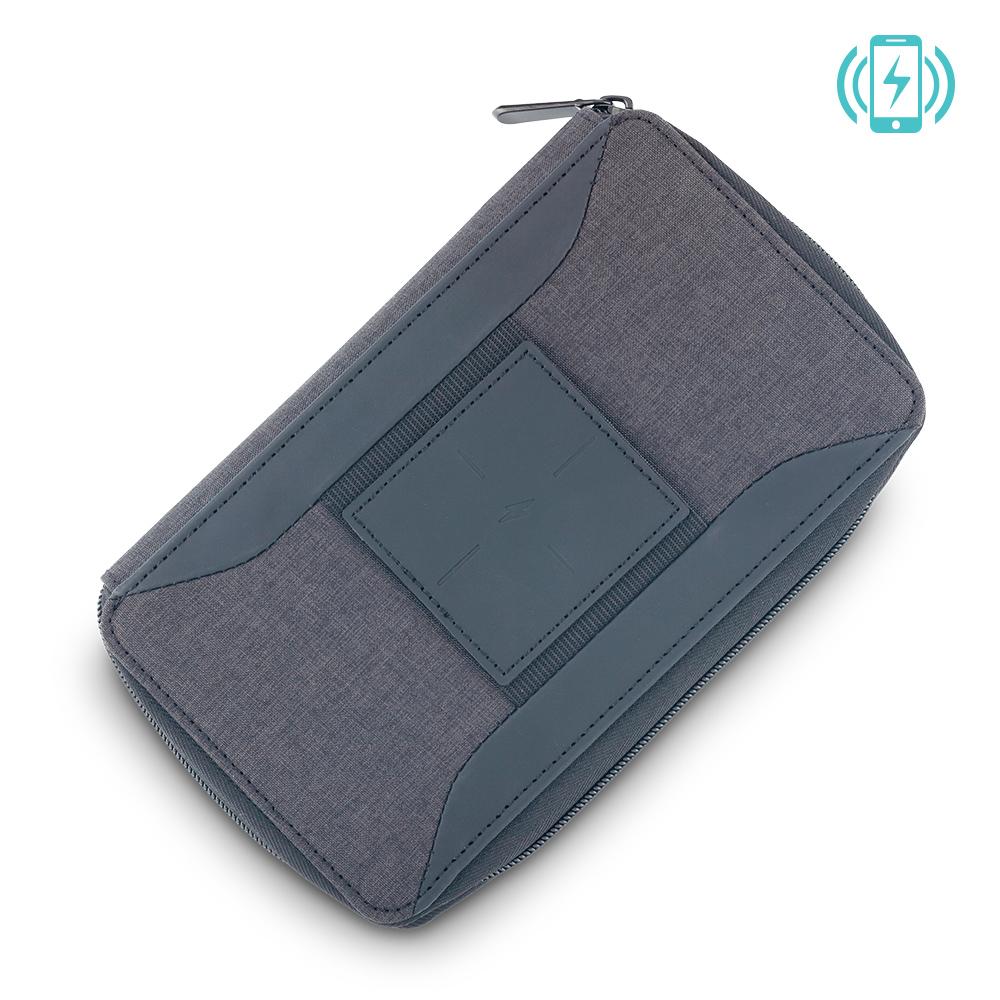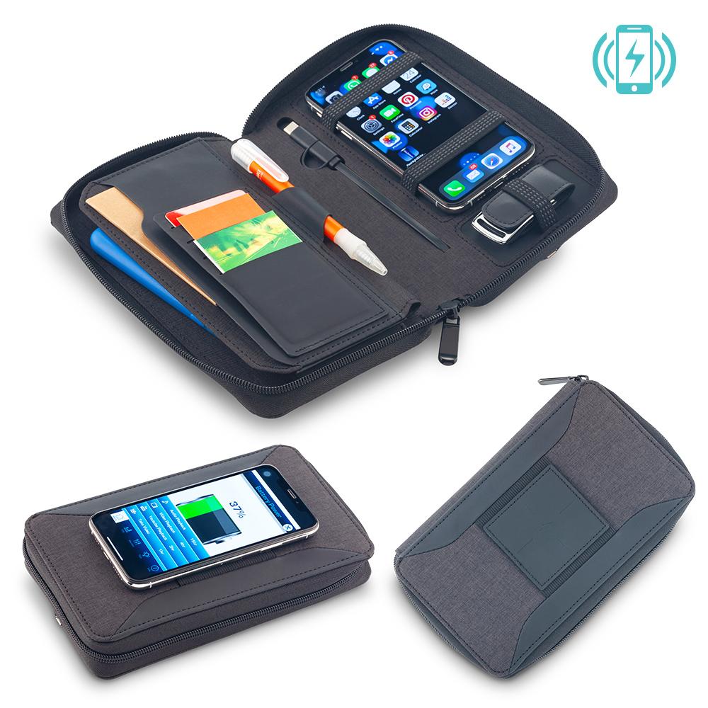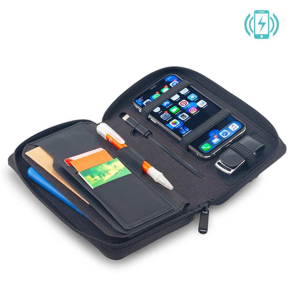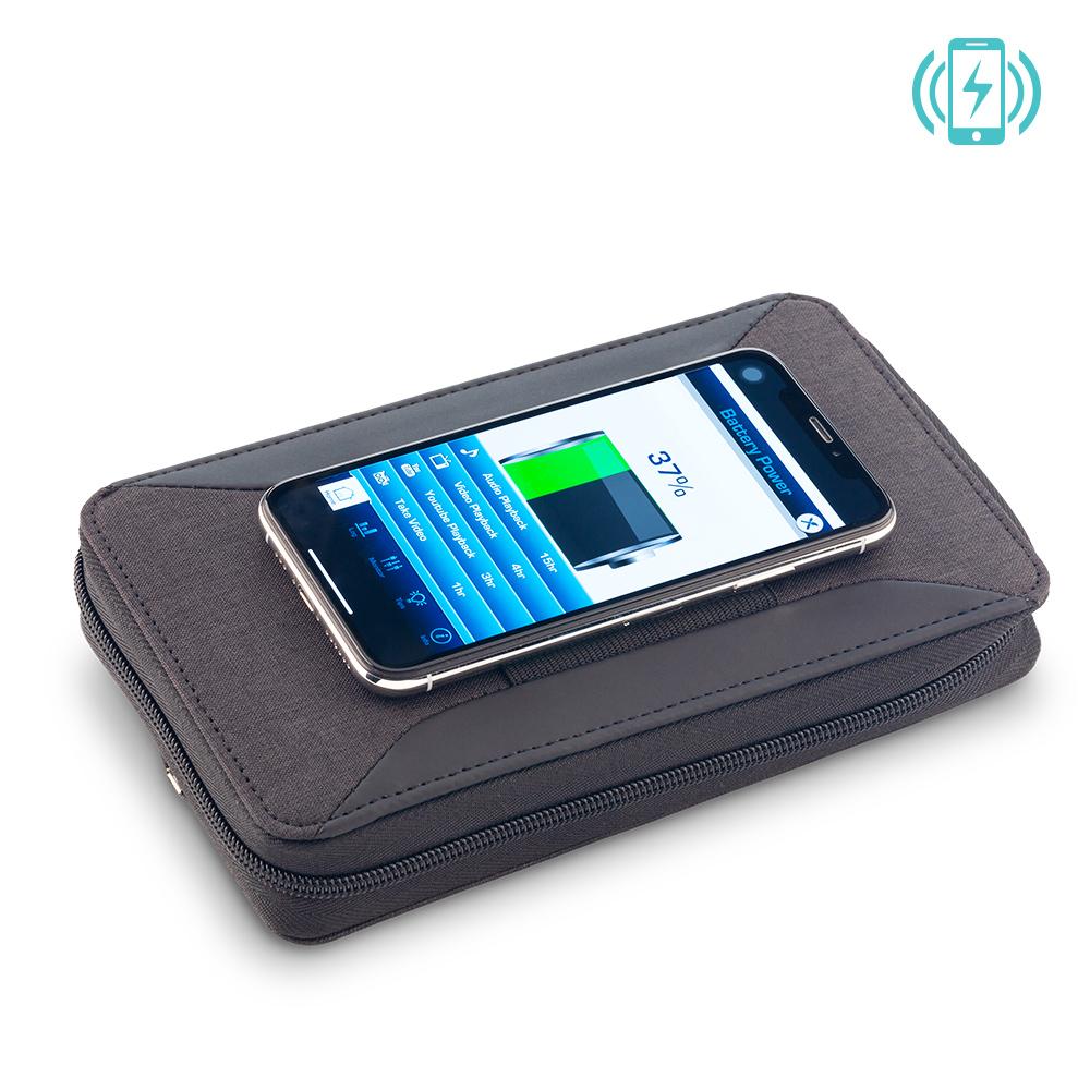 Portadocumentos en poliuretano con cierre de cremallera, cargador inalámbrico de 5W en la tapa superior, cable interno micro USB 2-1, pila incorporada de 4.000mAh. Input/Output (cable): 5V 2A / Output Wireless: 5V 1A. Empaque caja individual.