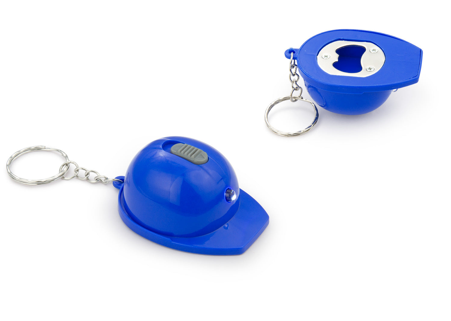 Llavero destapador en forma de casco con linterna LED. Con argolla para usar como llavero.