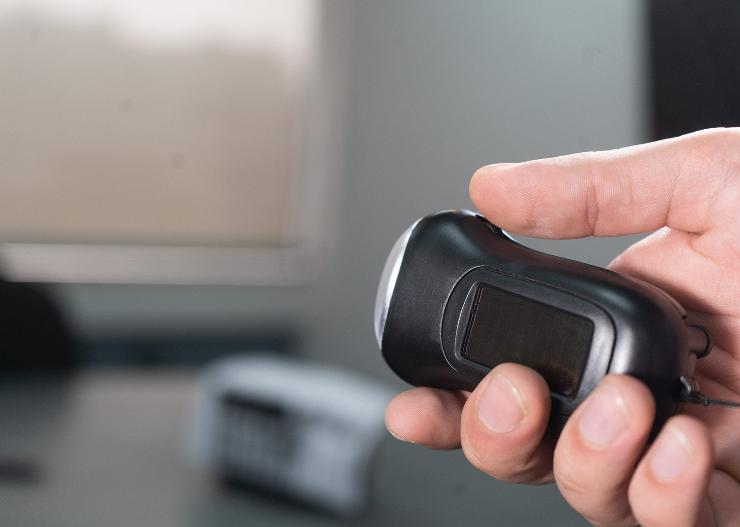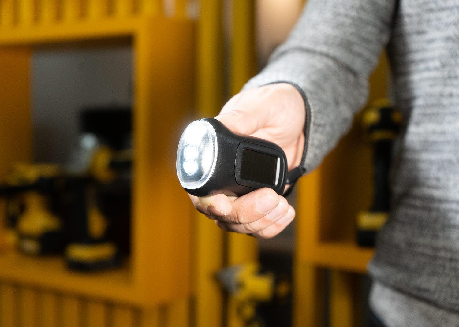 Linterna de funcionamiento solar y de dinamo, ecológica. Tiene cordón para transportarla. Ideal para situaciones de emergencia o iluminar espacios muy pequeños en detalle.