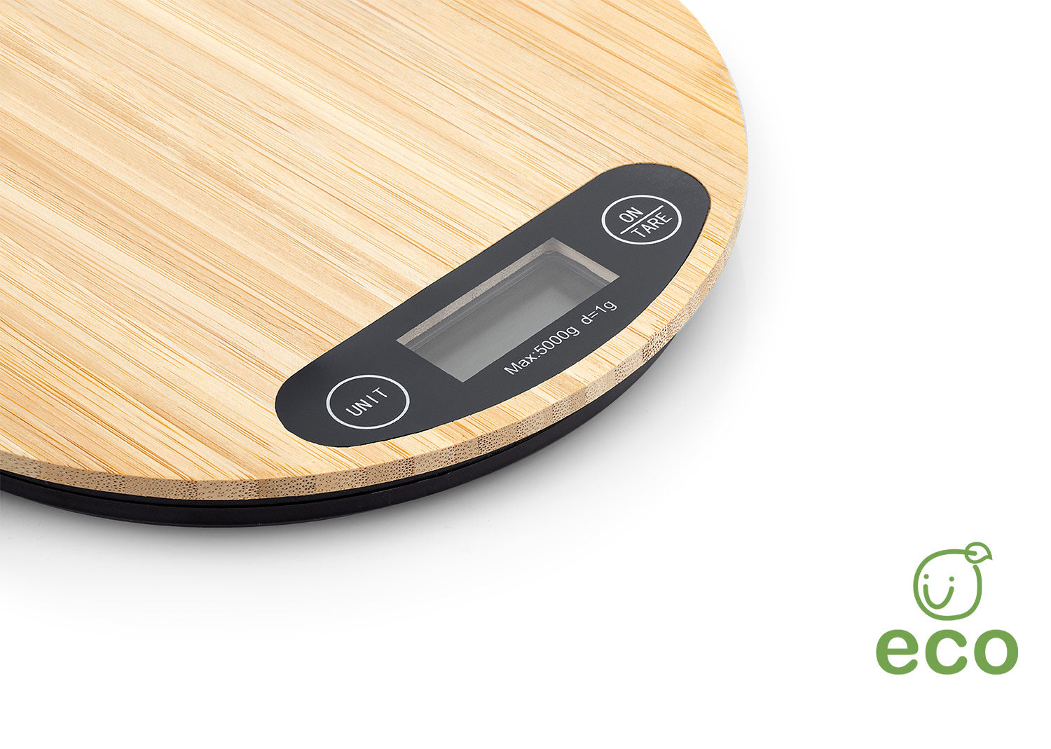 Balanza de cocina electrónica en forma circular de bambú con capacidad de 5 KG y sensibilidad de 1 gr. Función de Tara (puede restar el momento del recipiente al momento de pesar) Cuenta con indicador de batería, display LCD y apagado o reseteo automático. Uliza un par de pilas AAA (no incluidas)