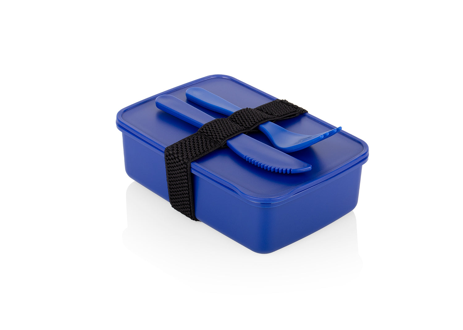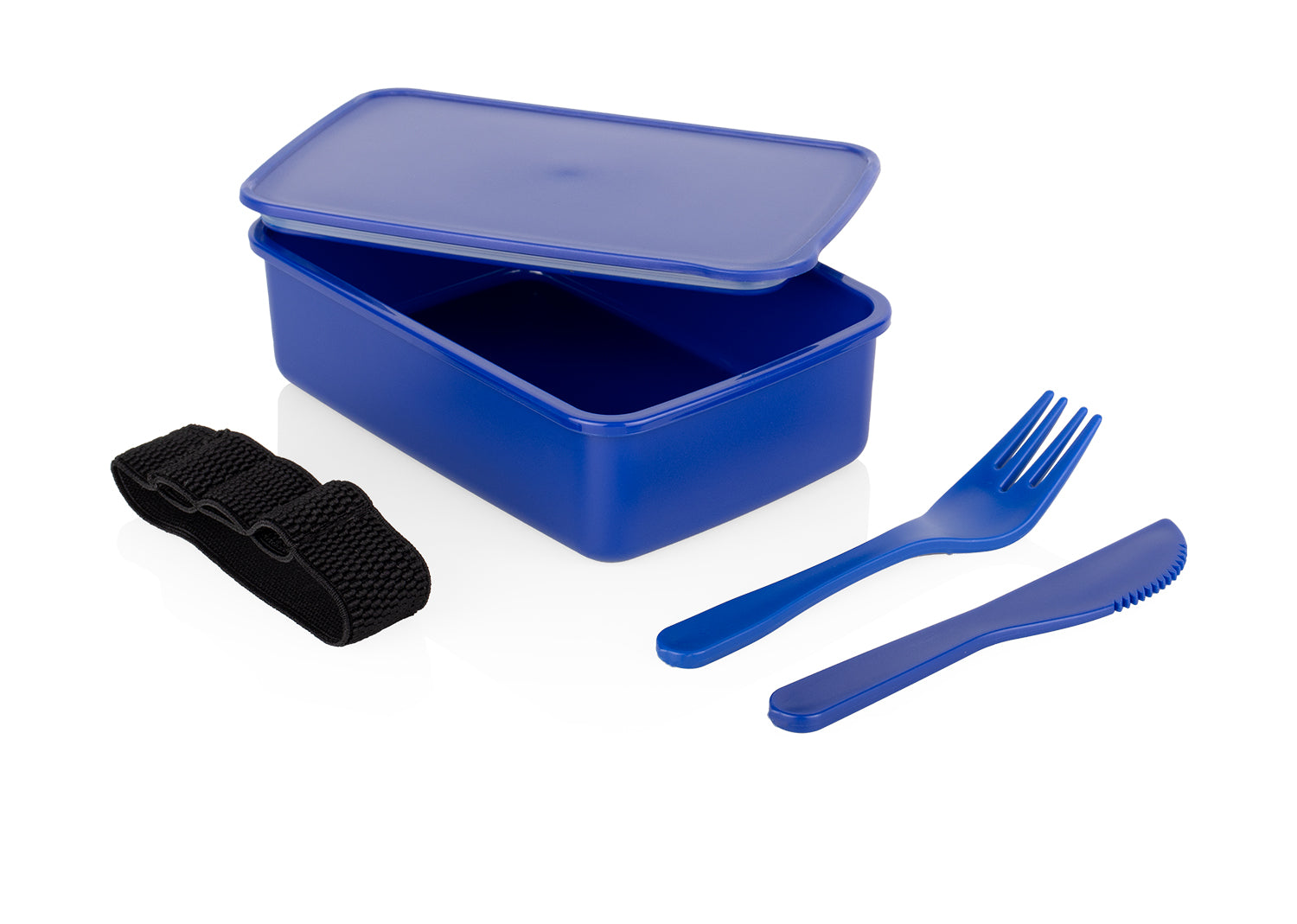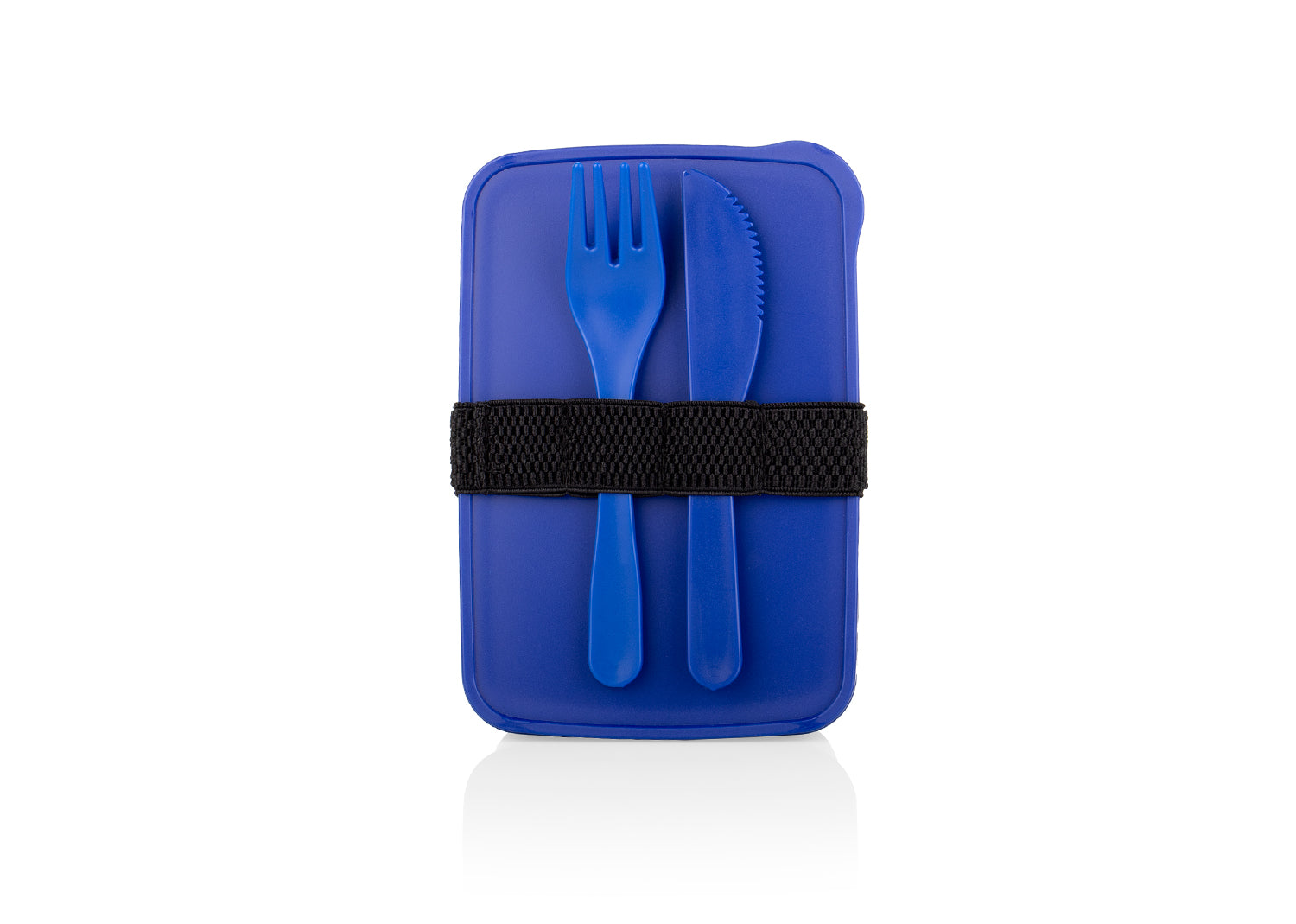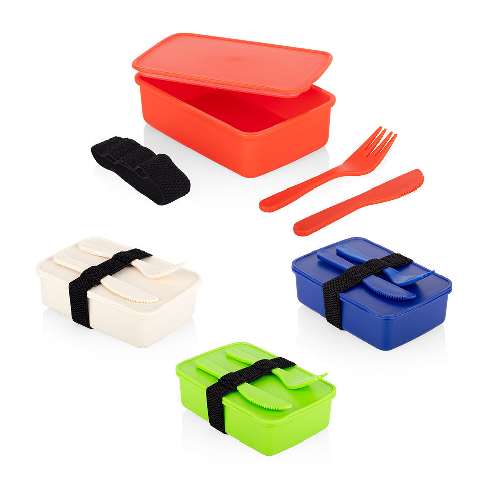 Portacomidas rectangular con banda de seguridad negra. Incluye cuchillo y tenedor.