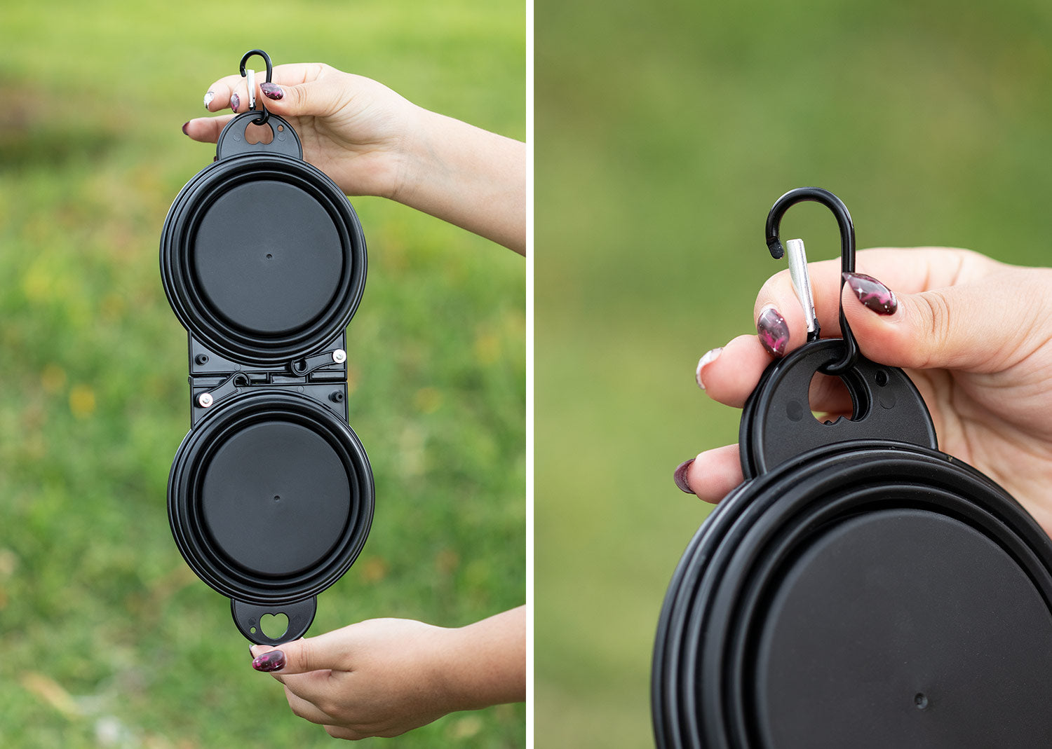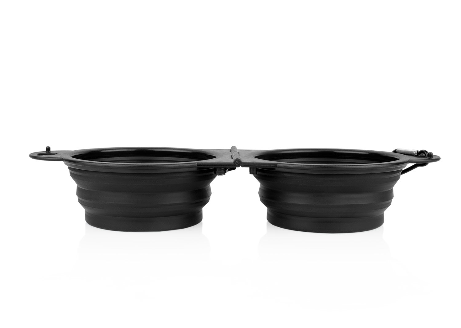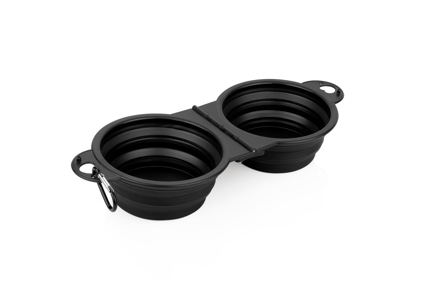 Bebedero de silicona plegable. Gracias a sus 2 compartimentos, puede ser usado para bebida y alimento simultáneamente. Es portátil e incluye gancho carabinero para transportarlo fácilmente. Además, cuenta con 2 pequeños ganchos plásticos de seguridad para evitar derrames. Capacidad: 400 ml / 13 Oz.