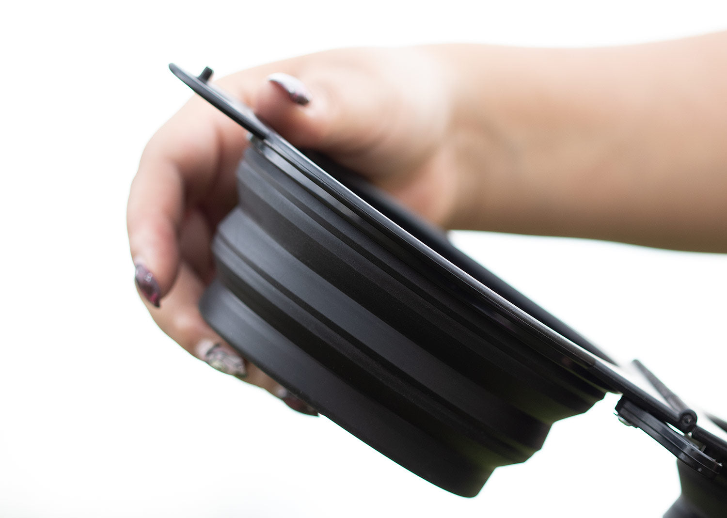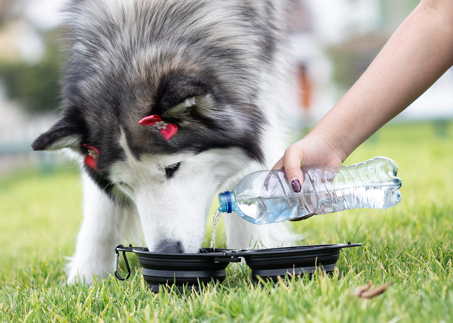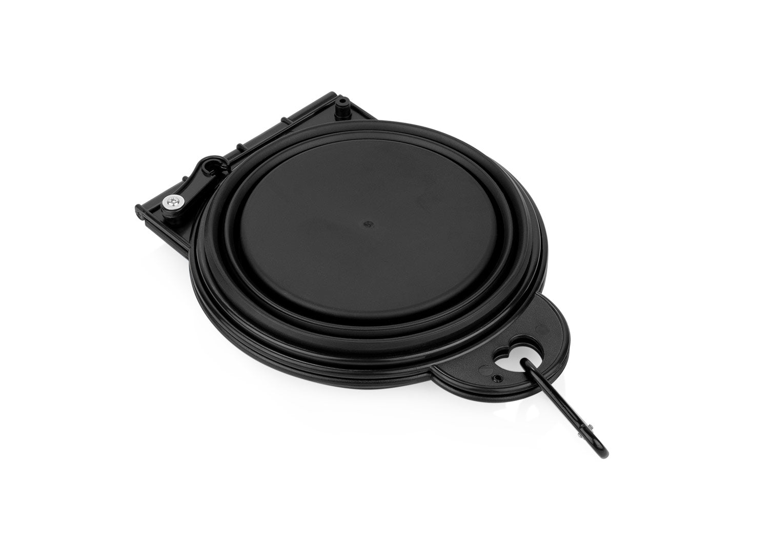 Bebedero de silicona plegable. Gracias a sus 2 compartimentos, puede ser usado para bebida y alimento simultáneamente. Es portátil e incluye gancho carabinero para transportarlo fácilmente. Además, cuenta con 2 pequeños ganchos plásticos de seguridad para evitar derrames. Capacidad: 400 ml / 13 Oz.