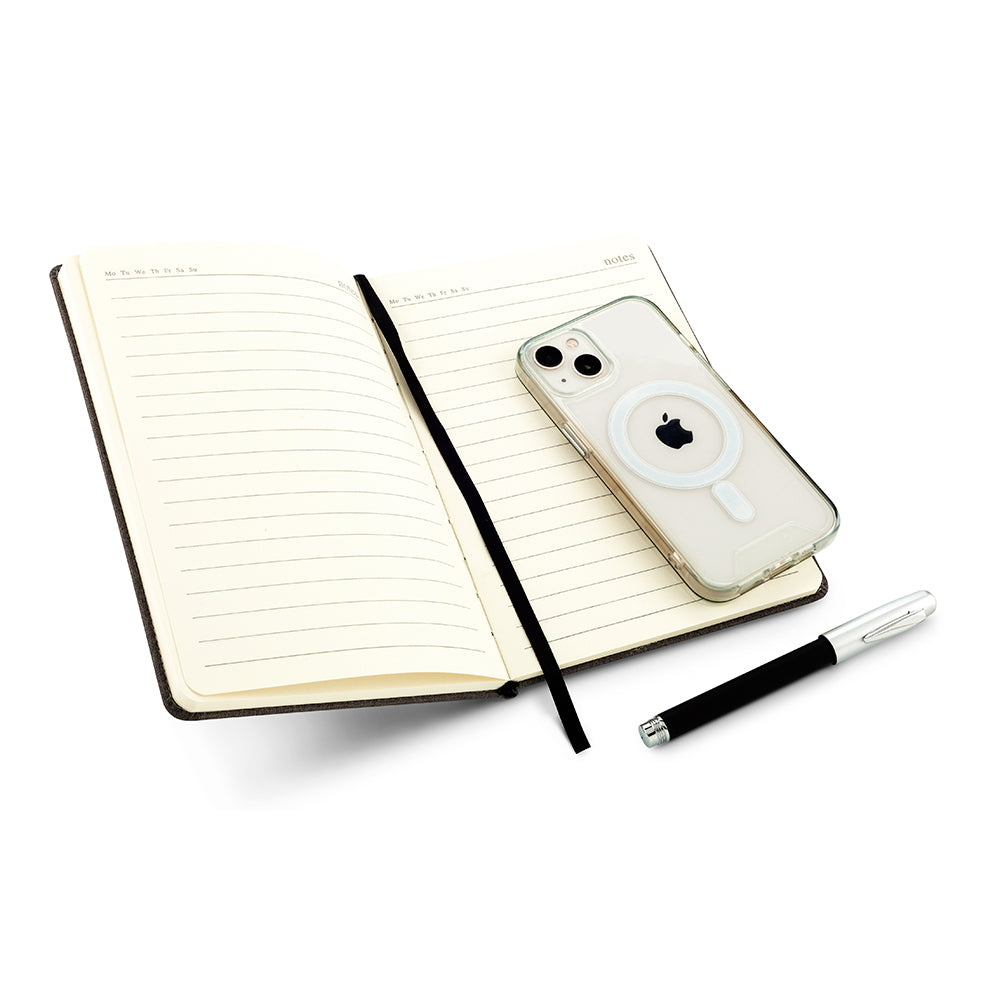 Libreta en políester, con dos orejas que funcionan como soporte para el celular. 112 hojas rayadas color crema. (No incluye bolígrafo).