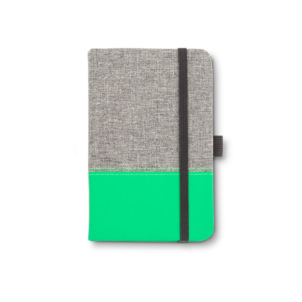 Mini libreta cubierta en tela y poliuretano con cierra elástico. 96 hojas rayadas. No incluye bolígrafo.