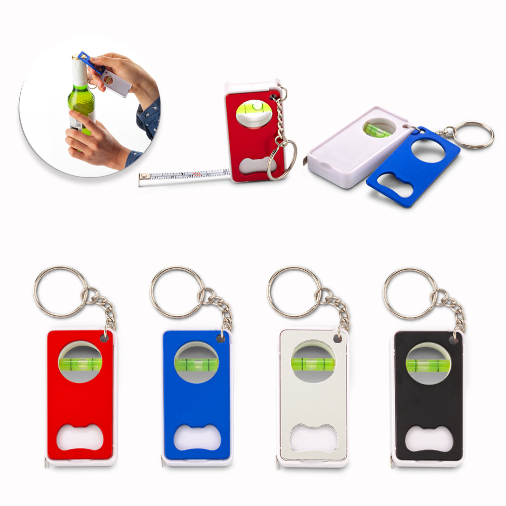 Llavero plástico con metro de 1mt con nivelador y destapador metálico.