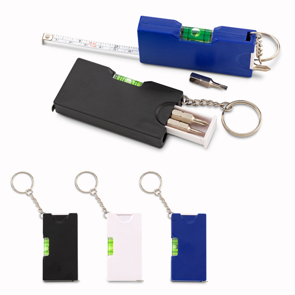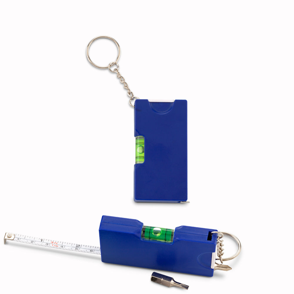Llavero plástico con metro de 1mt, con dos puntas de destornillador y nivelador.