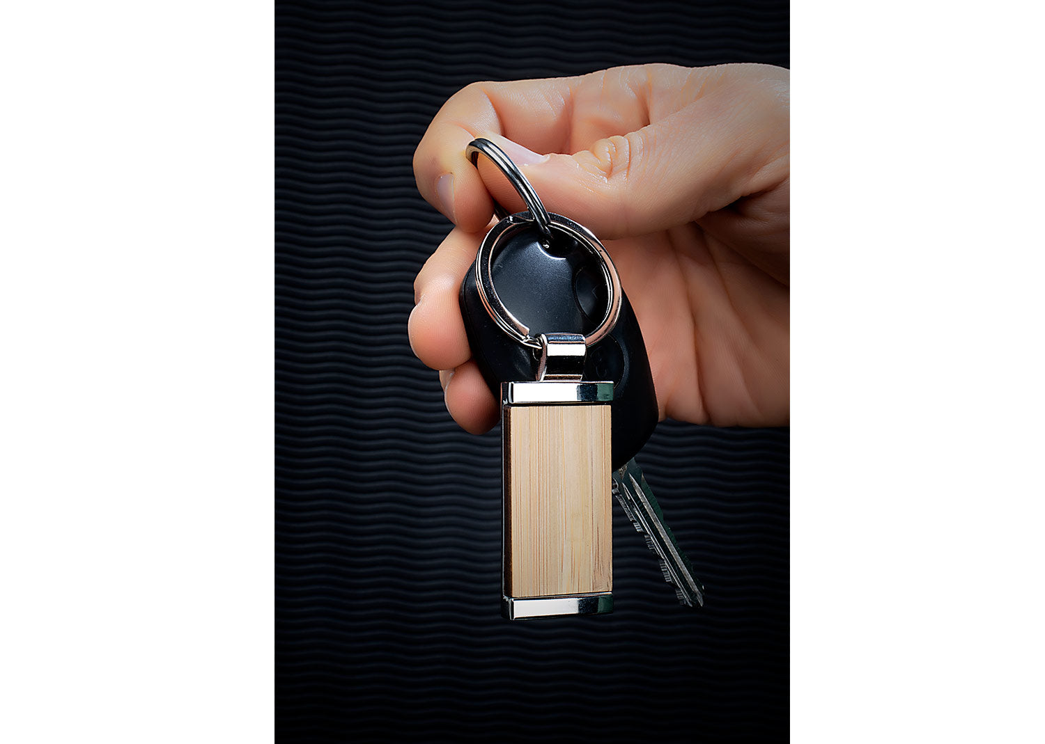 Llavero metálico rectangular con cubierta en Bambú