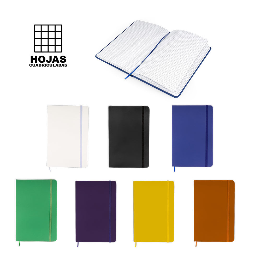 Libreta con cubierta forrada en imitación de cuero. Con banda elástica de cierre y cinta separadora. Contiene 80 hojas cuadriculadas. Tamaño aproximado de la hoja: A5.