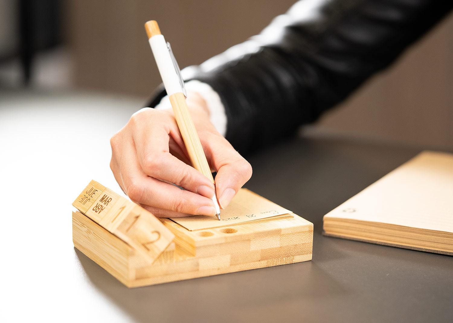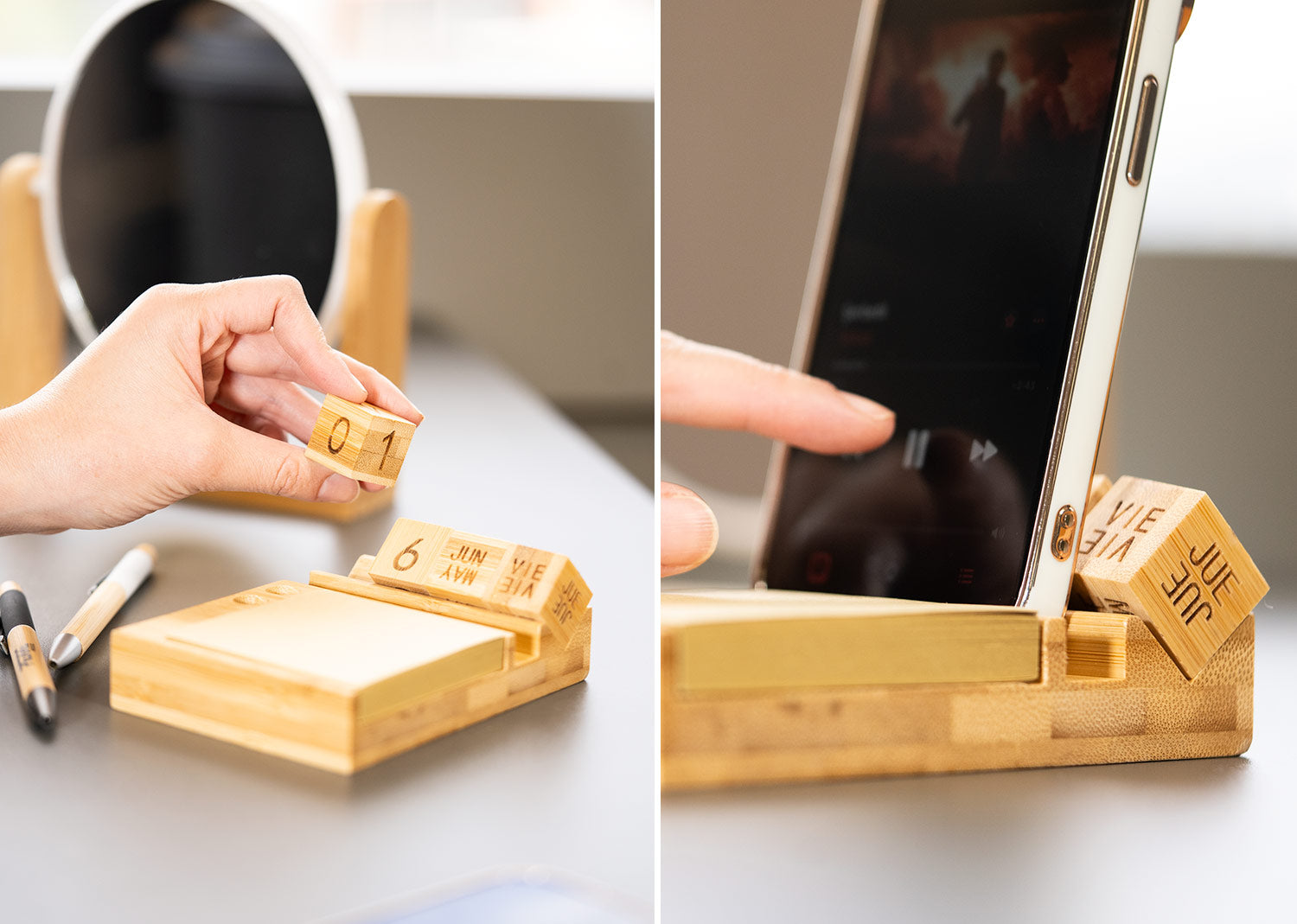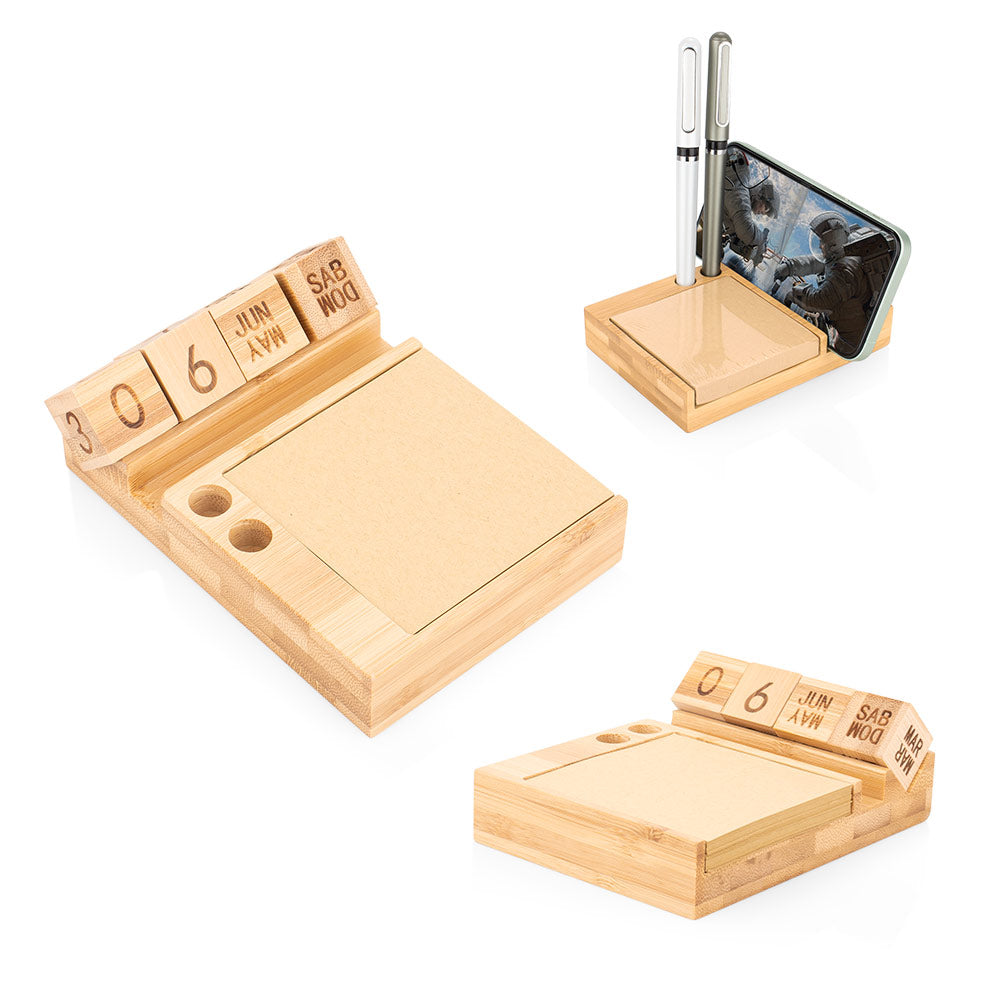 Porta notas de bambú con calendario perpetuo que muestra día, fecha y mes de forma continua, sin necesidad de reemplazo anual. Incluye 4 bloques giratorios de madera (2,3 X 2,3 X 2,3). Contiene 100 hojas de papel tipo kraft (7,6 X 7,6) y compartimentos para bolígrafos o accesorios. Diseño funcional y ecológico para escritorio.