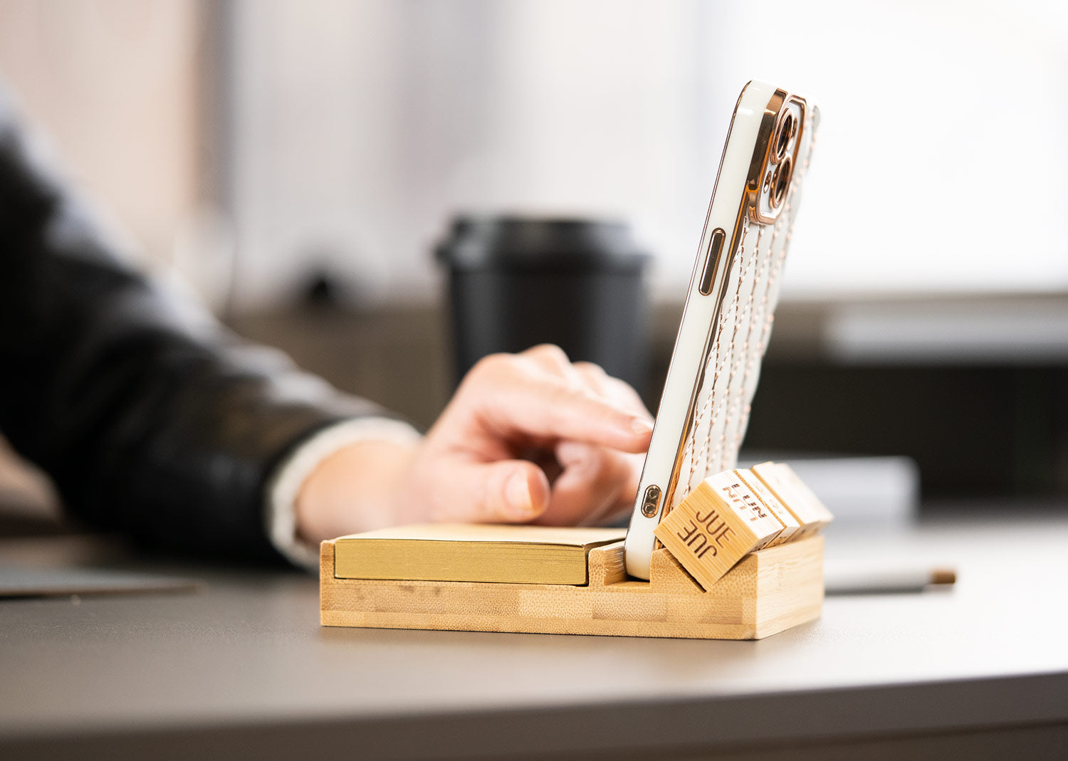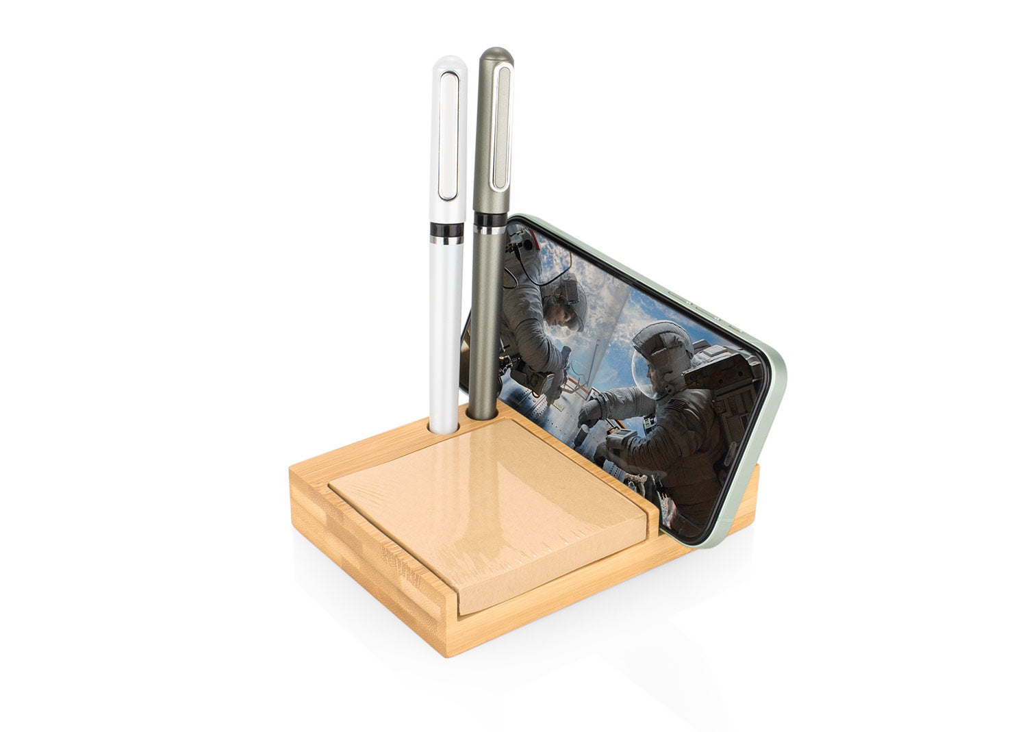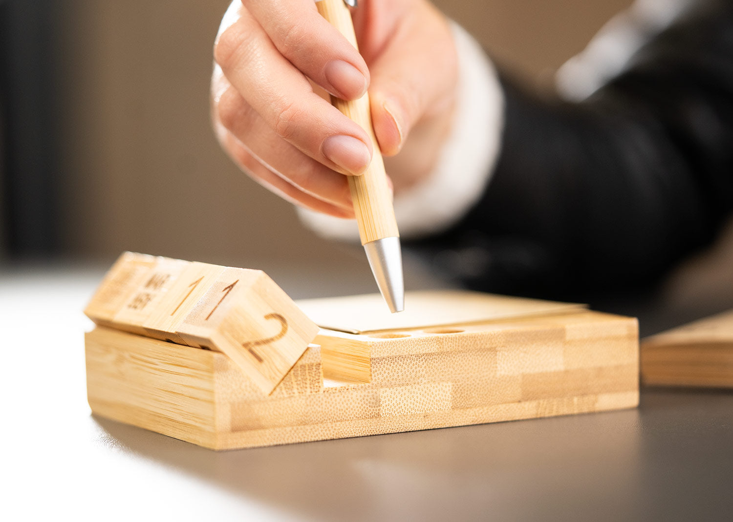 Porta notas de bambú con calendario perpetuo que muestra día, fecha y mes de forma continua, sin necesidad de reemplazo anual. Incluye 4 bloques giratorios de madera (2,3 X 2,3 X 2,3). Contiene 100 hojas de papel tipo kraft (7,6 X 7,6) y compartimentos para bolígrafos o accesorios. Diseño funcional y ecológico para escritorio.