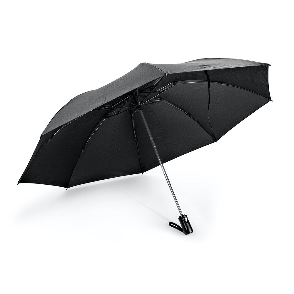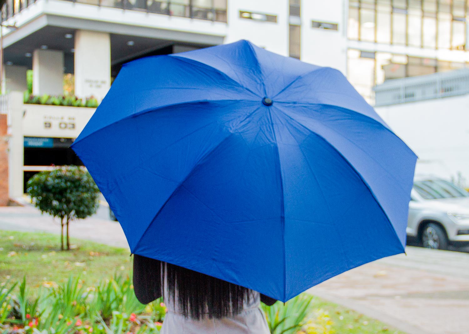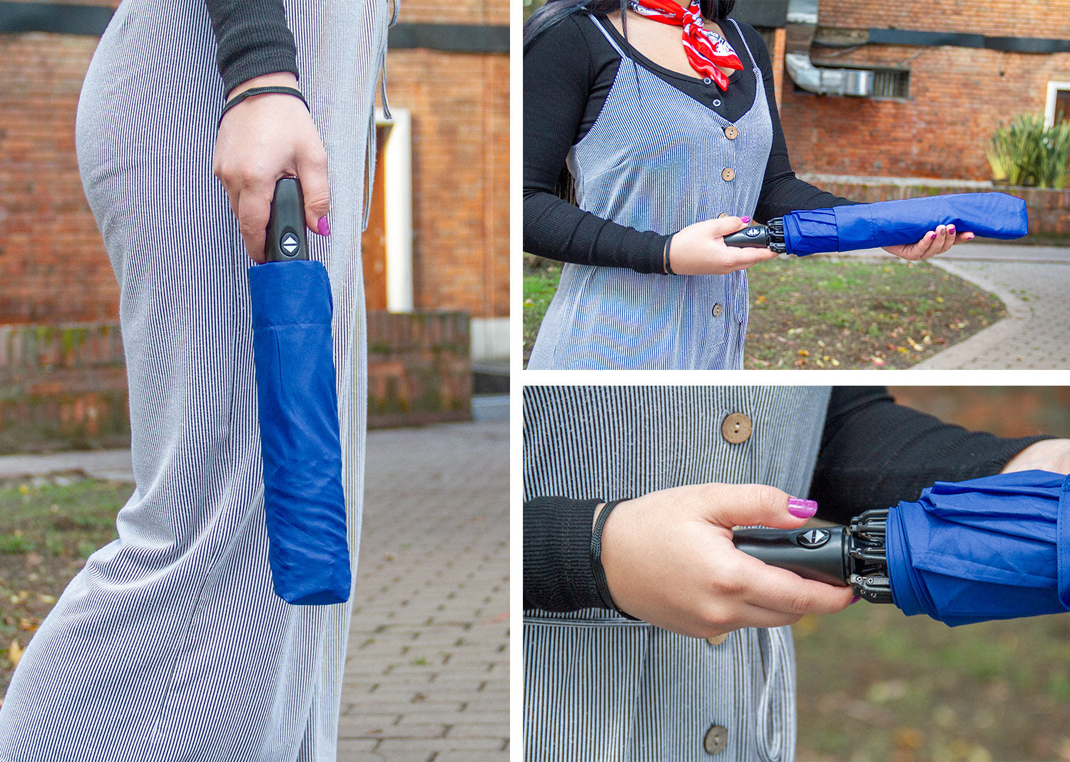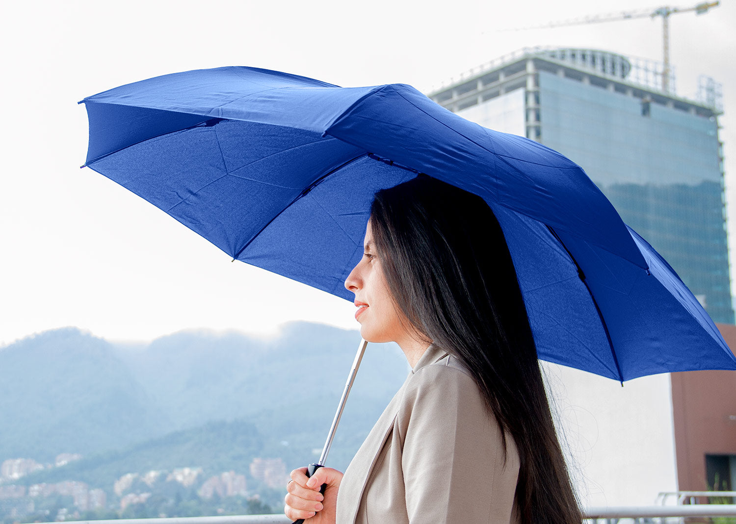 Paraguas reversible, 3 secciones, apertura y cierre automáticos, marco en fibra de vidrio y a prueba de viento. Antibrisa. marco en color negro, mango plástico. Tela pongee 190t. Incluye funda del mismo color del paraguas.