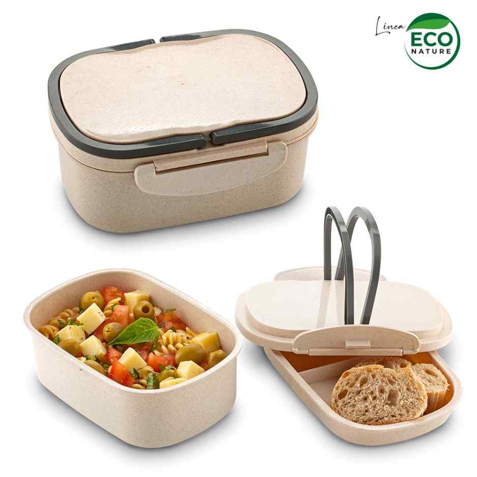 Portacomidas plástico con material ecológico en fibra de trigo, con dos compartimentos y manija.