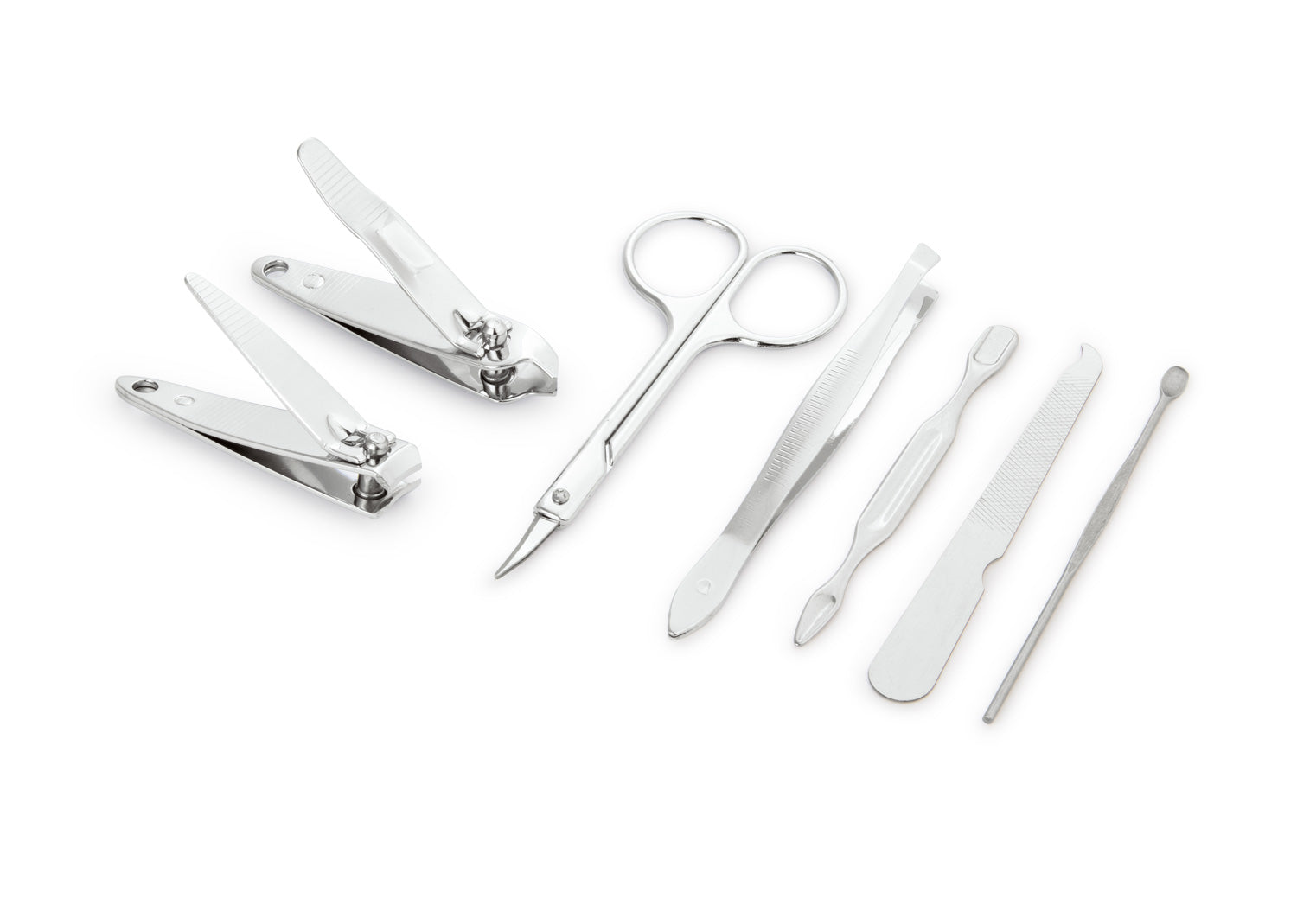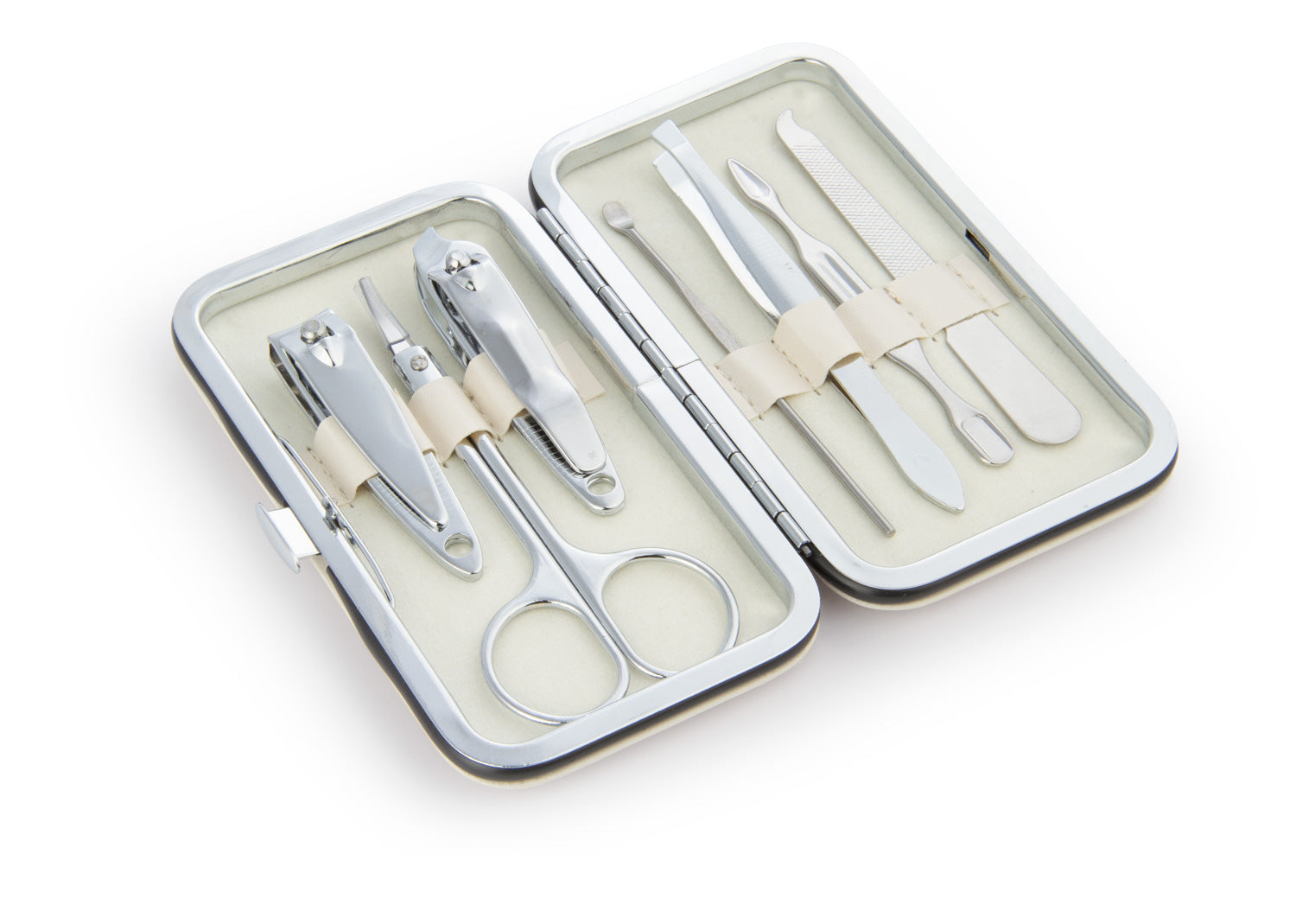 Set de manicure con cierre a presión que incluye: Lima, limpiador, depilador, bajacutículas, 2 cortauñas y tijeras.
