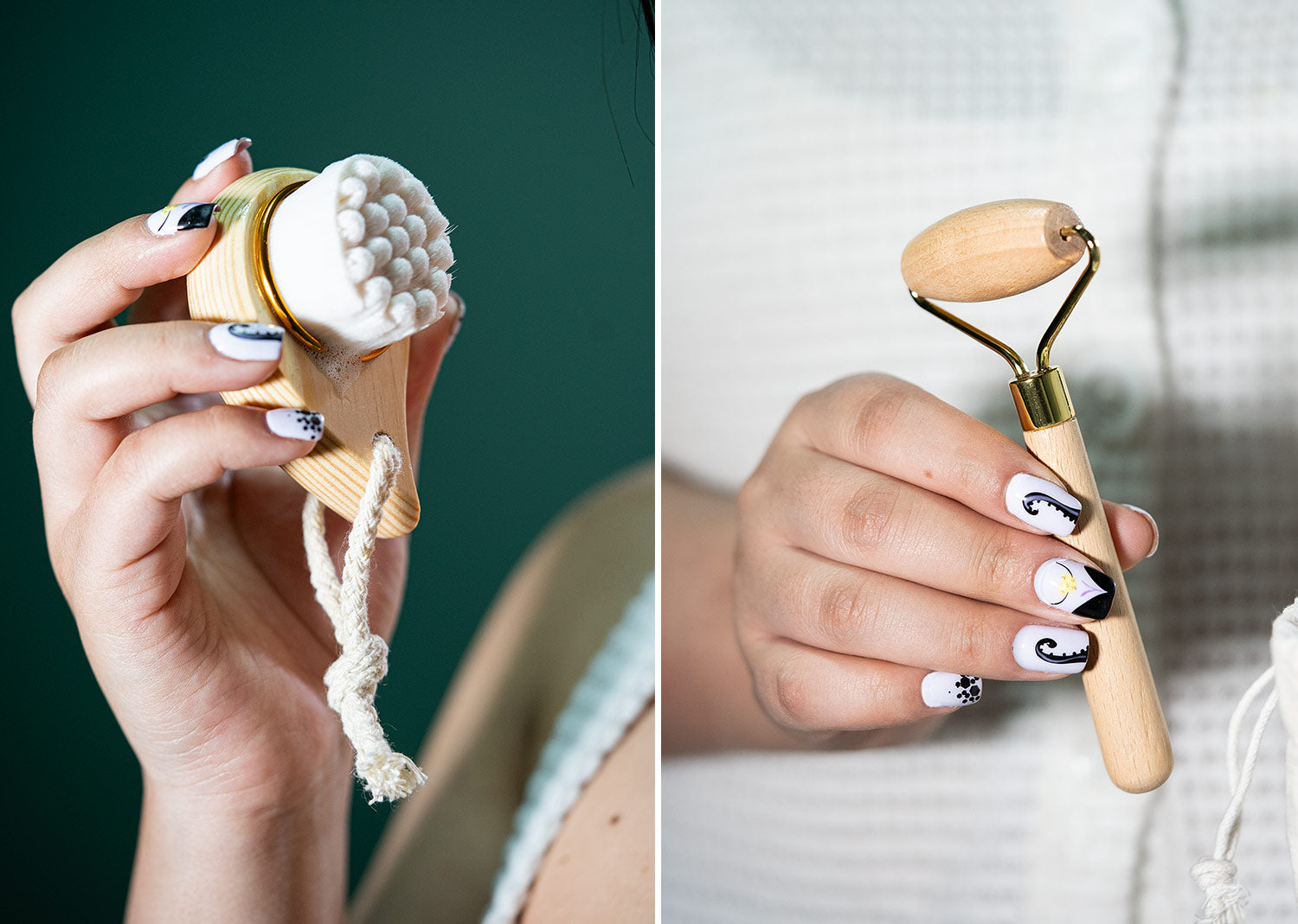 Kit para el cuidado facial que estimula la microcirculación y mejora la apariencia de la piel, reduciendo la aspecto de los ojos cansados. Incluye un rodillo de madera, un cepillo facial ultra suave y una bolsa de algodón que resulta práctica para guardar y transportar.