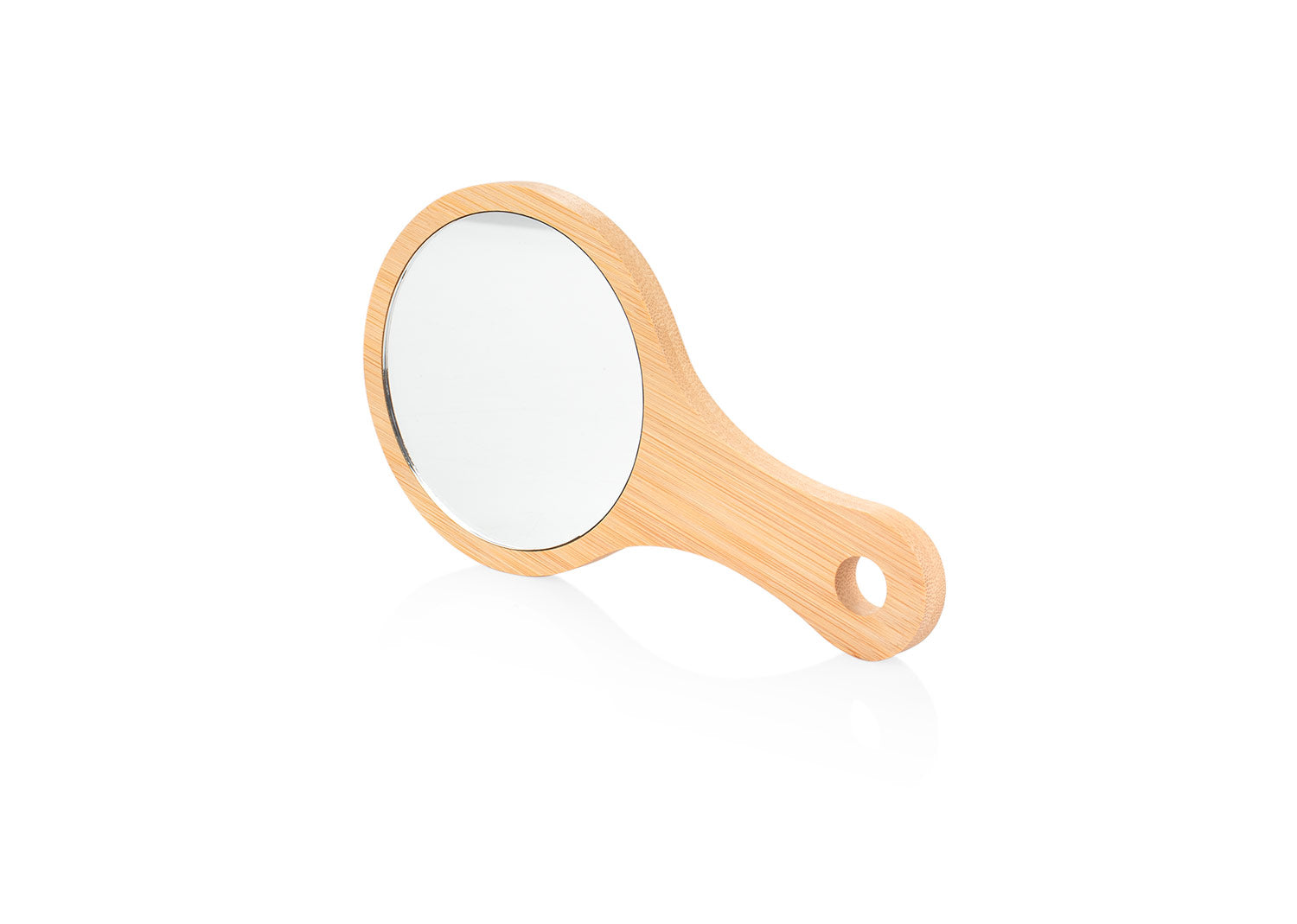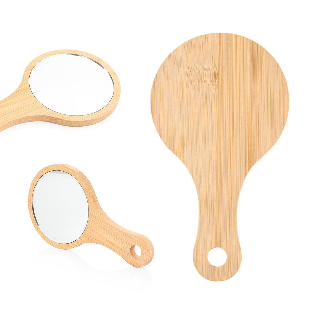 Espejo redondo de bambú con mango Fabricado en madera de bambú, este espejo de forma redonda incluye un práctico mango para sujetarlo fácilmente y un orificio inferior que permite colgarlo cuando no está en uso.