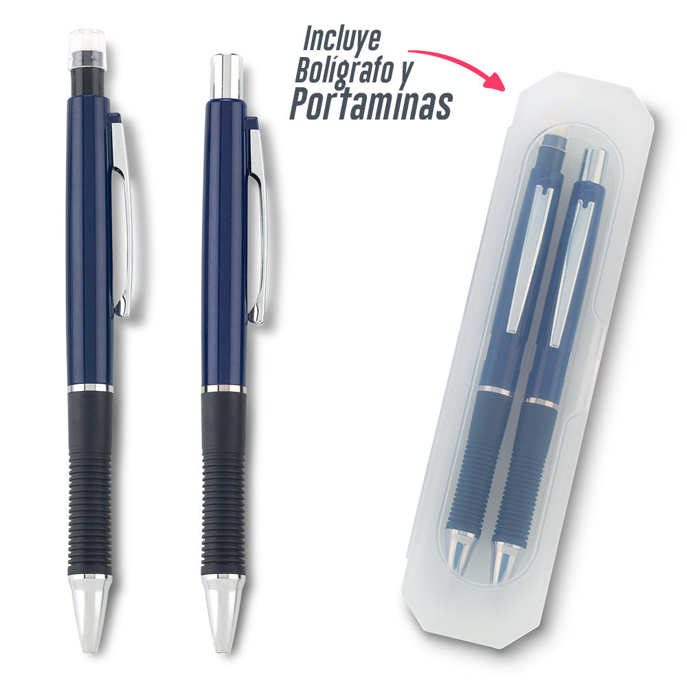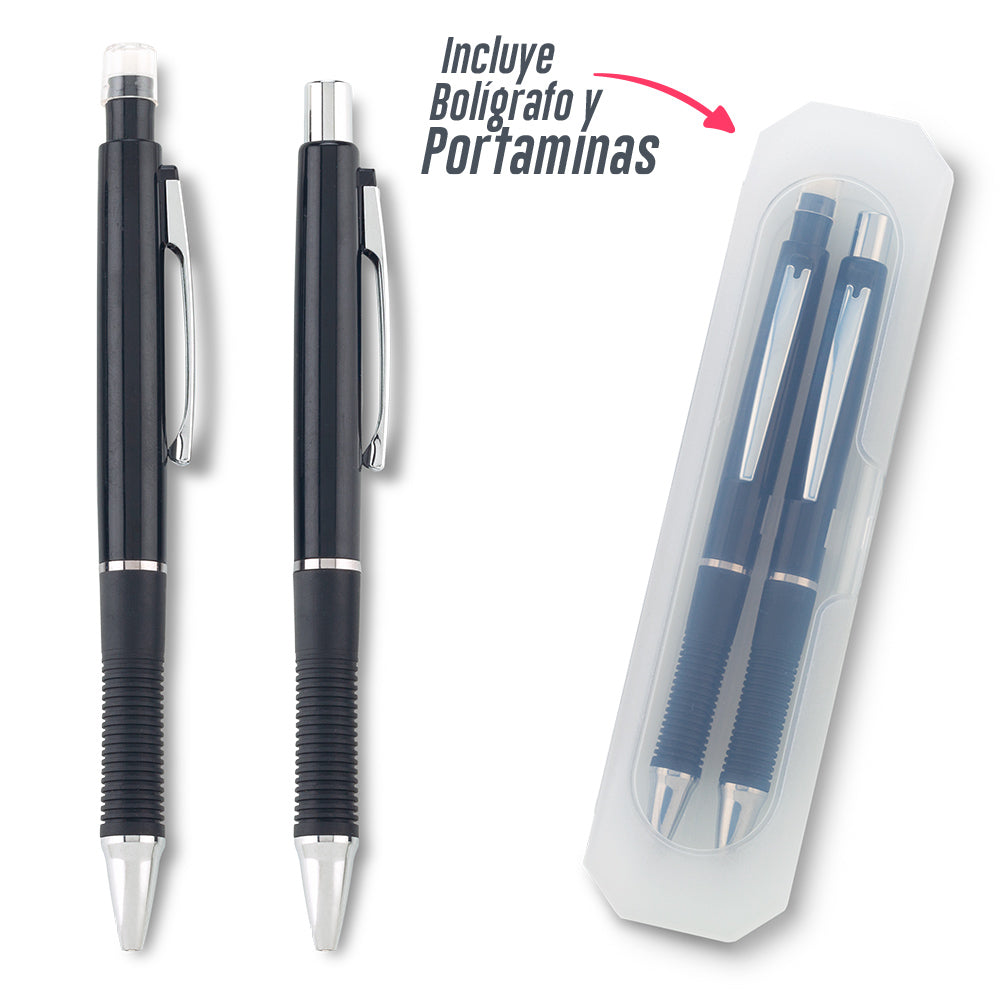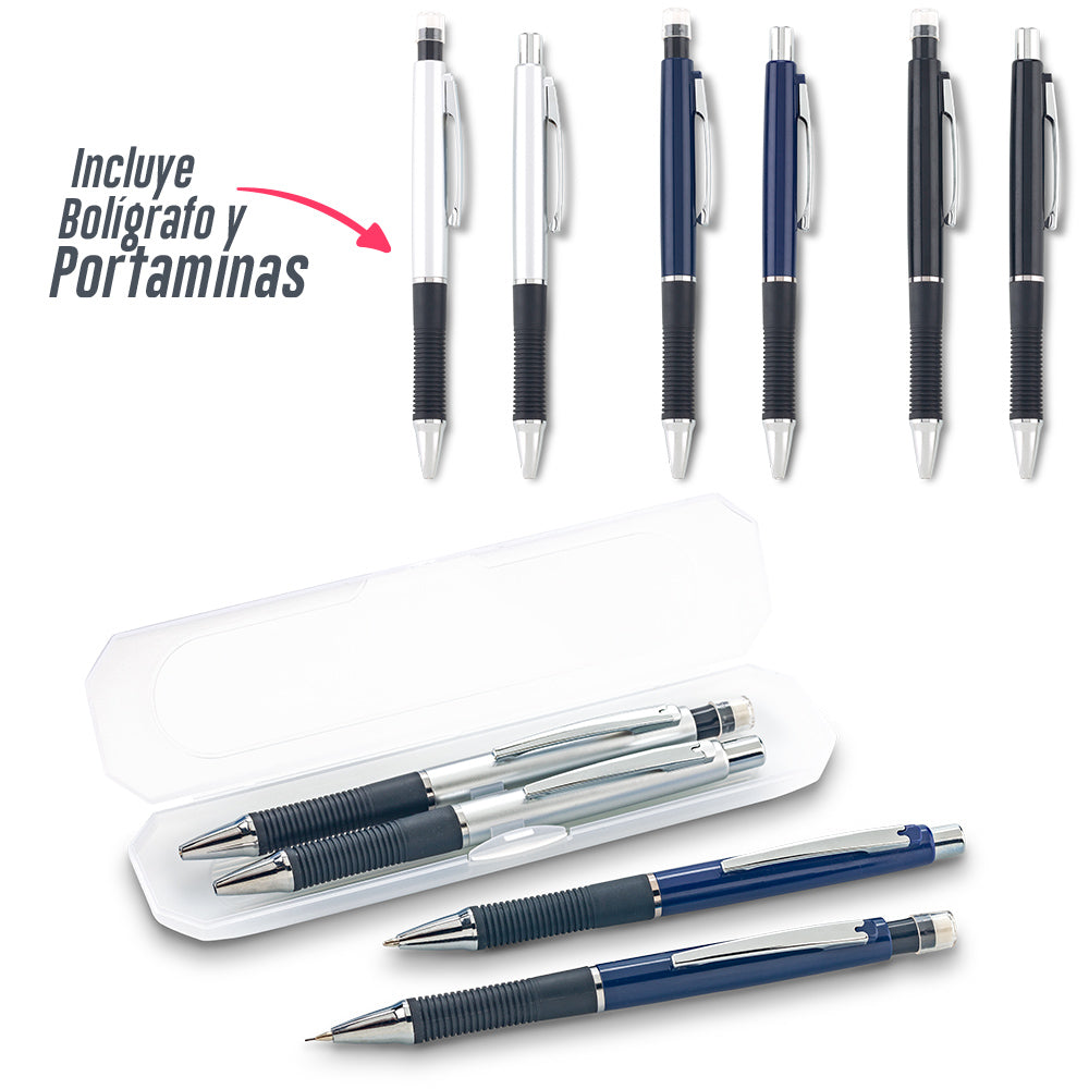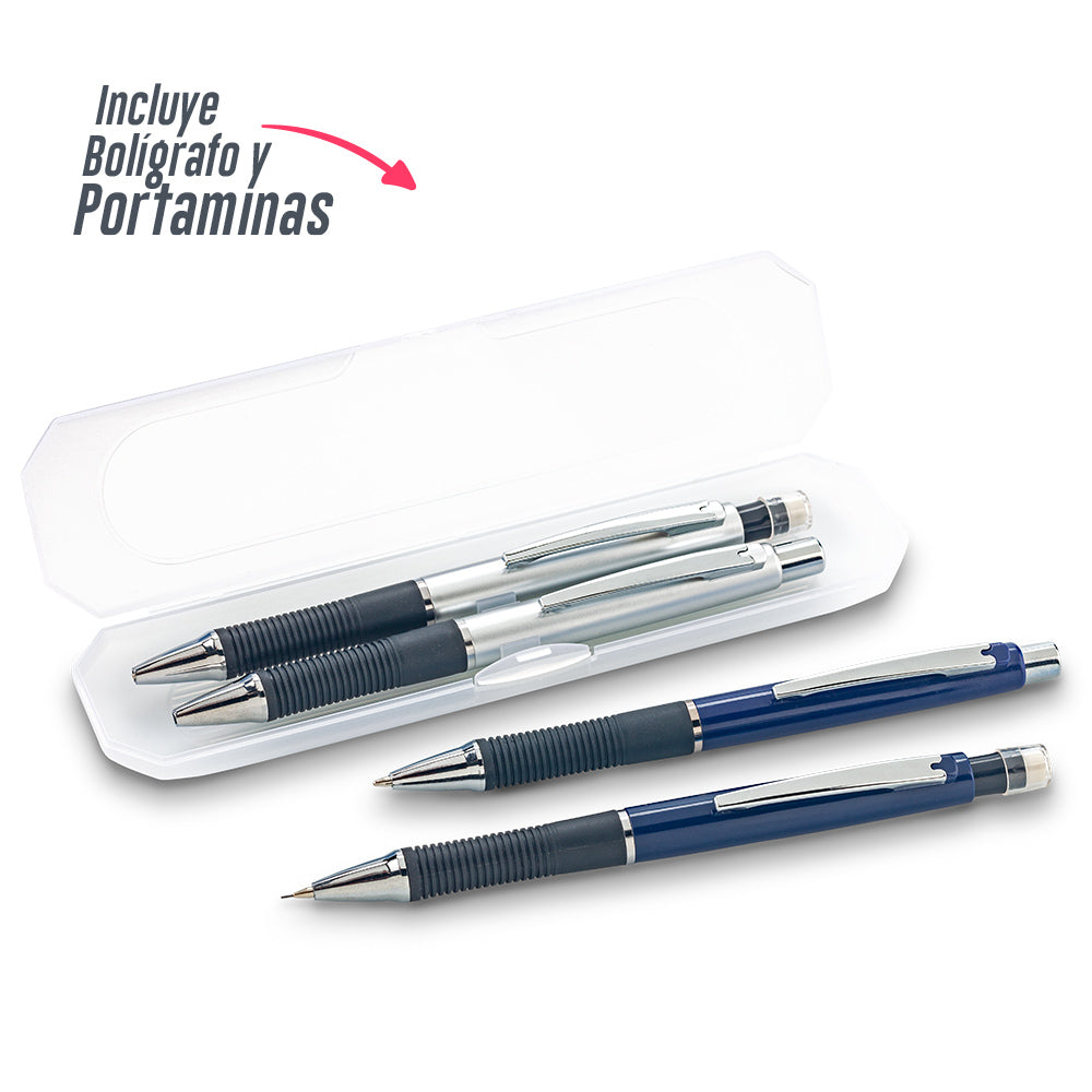 Set de bolígrafo y portaminas plásticos en estuche plástico. Mina portaminas 0.5 mm. Medidas: Bolígrafo: 13.5 cm Caja: 17 cm x 4.2 cm x 1.8 cm.