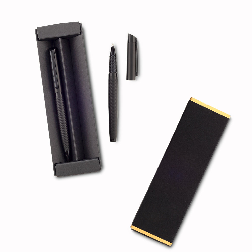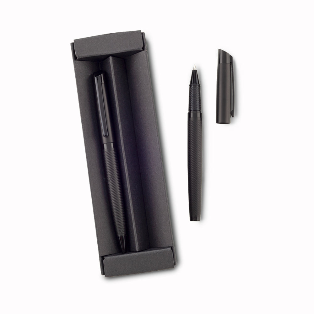 Set de bolígrafo con mecanismo twist y roller. Estuche individual en cartón.