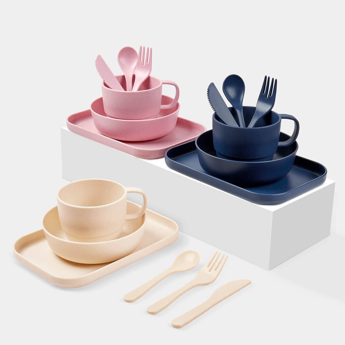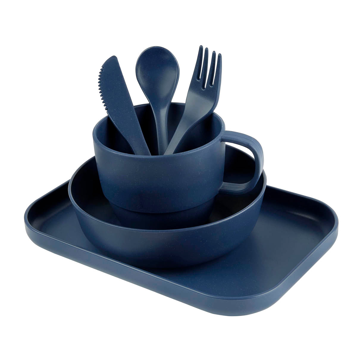 Descripción: Vajilla de 6 piezas con material eco-friendly. Contiene plato extendido, plato hondo, taza, cuchara, tenedor y cuchillo. Con un diseno atractivo y funcional, es ideal tanto para los mas pequenos como para los adultos, garantizando una experiencia de comida segura y respetuosa con el medio ambiente. Incluye caja individual. No apto para lavavajillas ni microondas.
