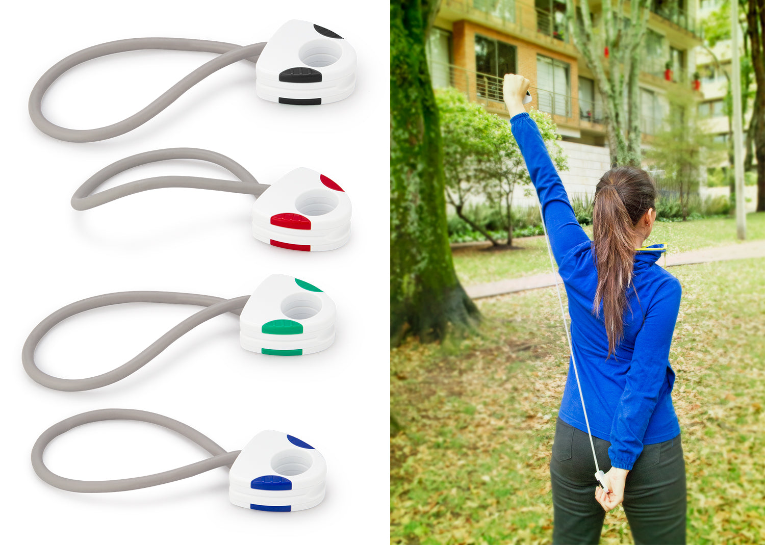 Banda elástica ideal para hacer entrenamiento fitness o de resistencia, con manijas para mejor agarre y sistema de apertura twist para separarlas, largo de la banda extendida 48 cm.