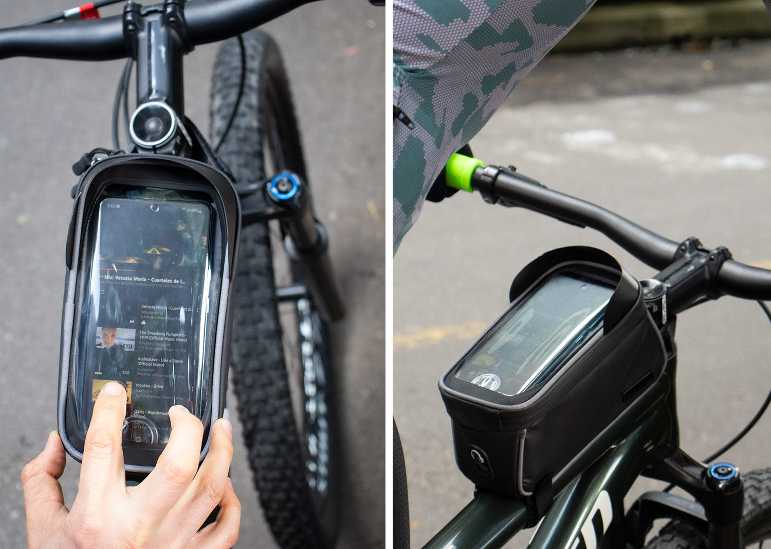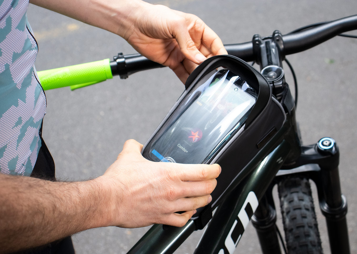 Estuche impermeable para bicicleta, bolsilo transparente para ubicar el celular de 5,8", (permite manipular el celular sin que se moje). Doble cremallera, orificio ideal para audífonos, Incluye placa metálica para marca láser.