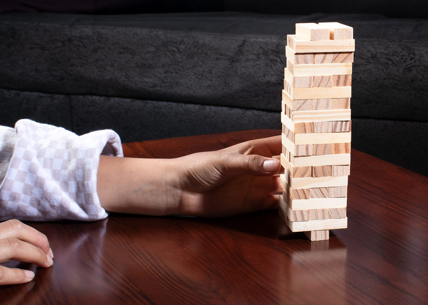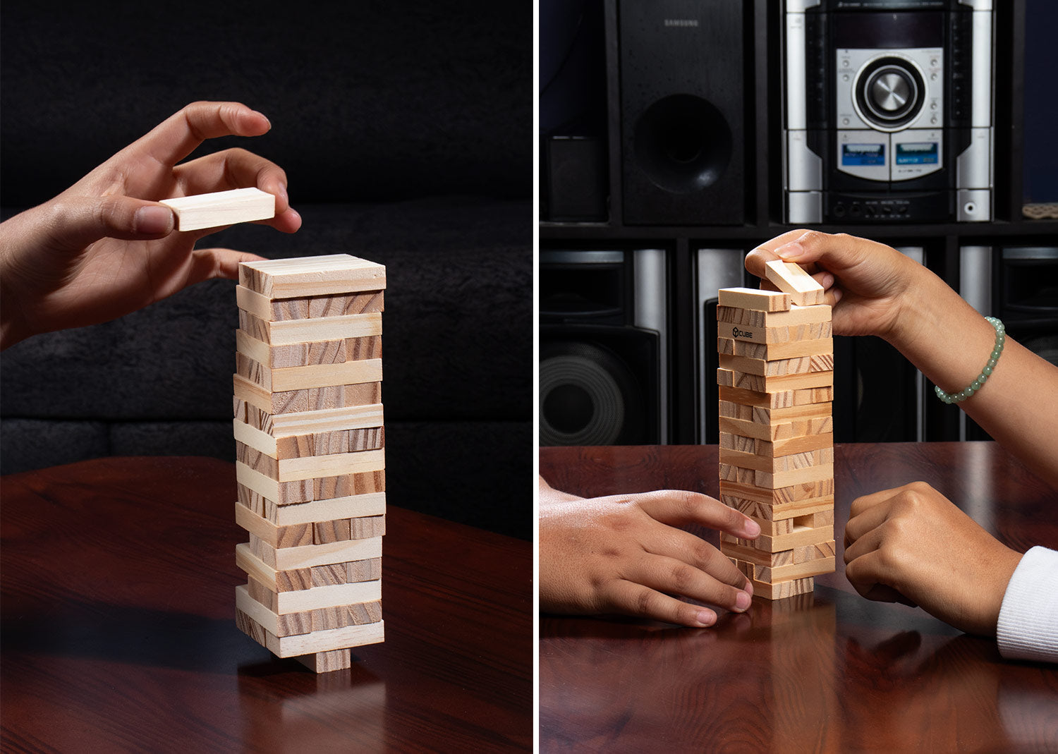 Juego de mesa clásico, que permite practicar la habilidad y equilibrio mientras se divierte. Cada turno debe retirar uno de los bloques y colocarlo en la parte superior. Estuche de algodón.